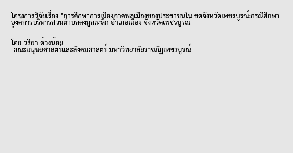 การศึกษาการเมืองภาคพลเมืองของประชาชนในเขตจังหวัดเพชรบูรณ์:กรณีศึกษา องค์การบริหารส่วนตำบลดงมูลเหล็ก อำเภอเมือง จังหวัดเพชรบูรณ์