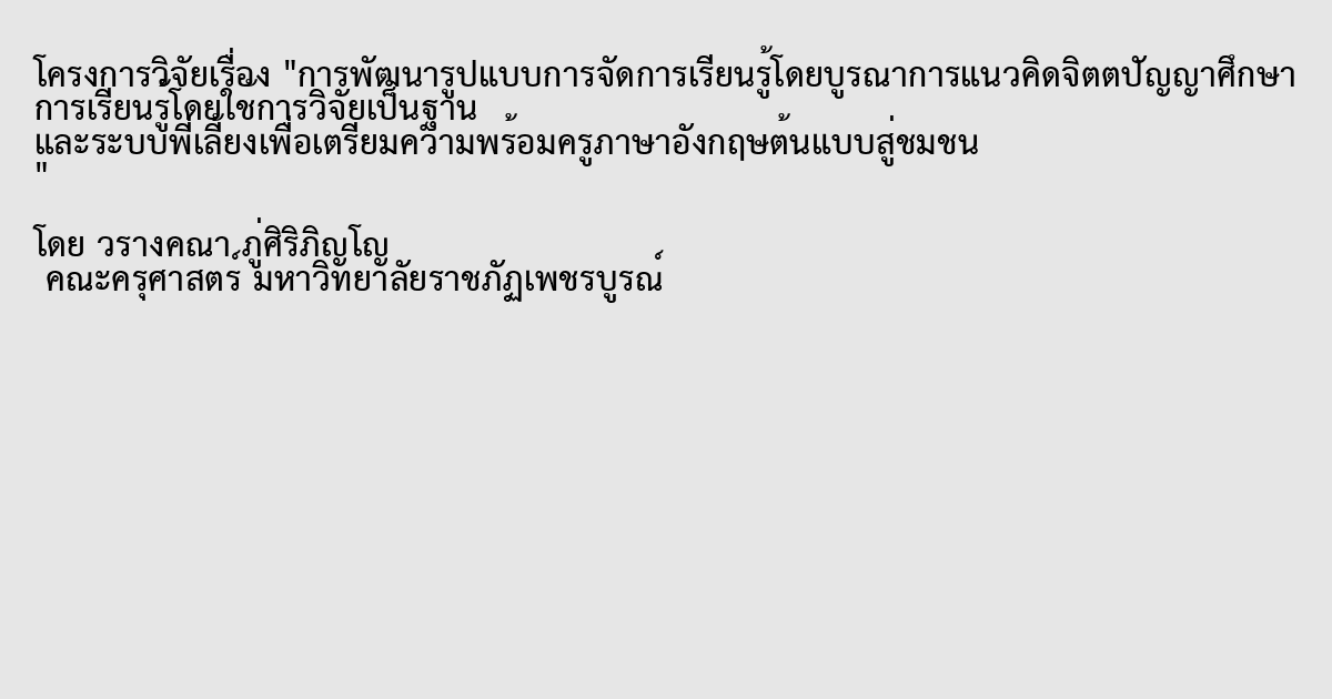 การพัฒนารูปแบบการจัดการเรียนรู้โดยบูรณาการแนวคิดจิตตปัญญาศึกษา การเรียนรู้โดยใช้การวิจัยเป็นฐาน และระบบพี่เลี้ยงเพื่อเตรียมความพร้อมครูภาษาอังกฤษต้นแบบสู่ชมชน