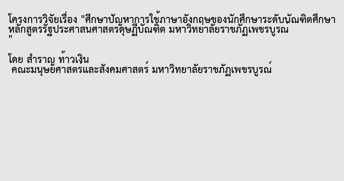 การวิจัยครั้งนี้มีวัตถุประสงค์เพื่อศึกษาปัญหาการใช้ภาษาอังกฤษของนักศึกษาระดับบัณฑิตศึกษา หลักสูตรรัฐประศาสนศาสตรดุษฏีบัณฑิต มหาวิทยาลัยราชภัฏเพชรบูรณ์ กลุ่มตัวอย่างที่ใช้ในการศึกษาครั้งนี้เป็นนักศึกษาระดับปริญญาเอก หลักสูตรรัฐประศาสนศาสตรดุษฎีบัณฑิต