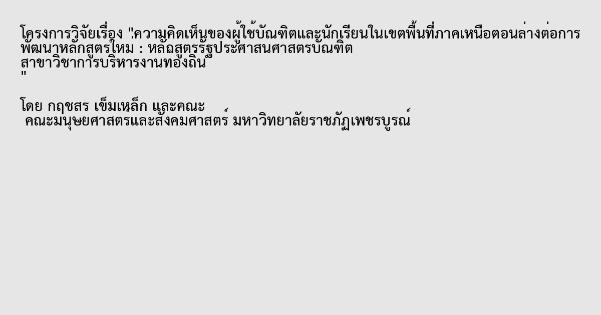 ความคิดเห็นของผู้ใช้บัณฑิตและนักเรียนในเขตพื้นที่ภาคเหนือตอนล่างต่อการพัฒนาหลักสูตรใหม่ : หลักสูตรรัฐประศาสนศาสตรบัณฑิต สาขาวิชาการบริหารงานท้องถิ่น