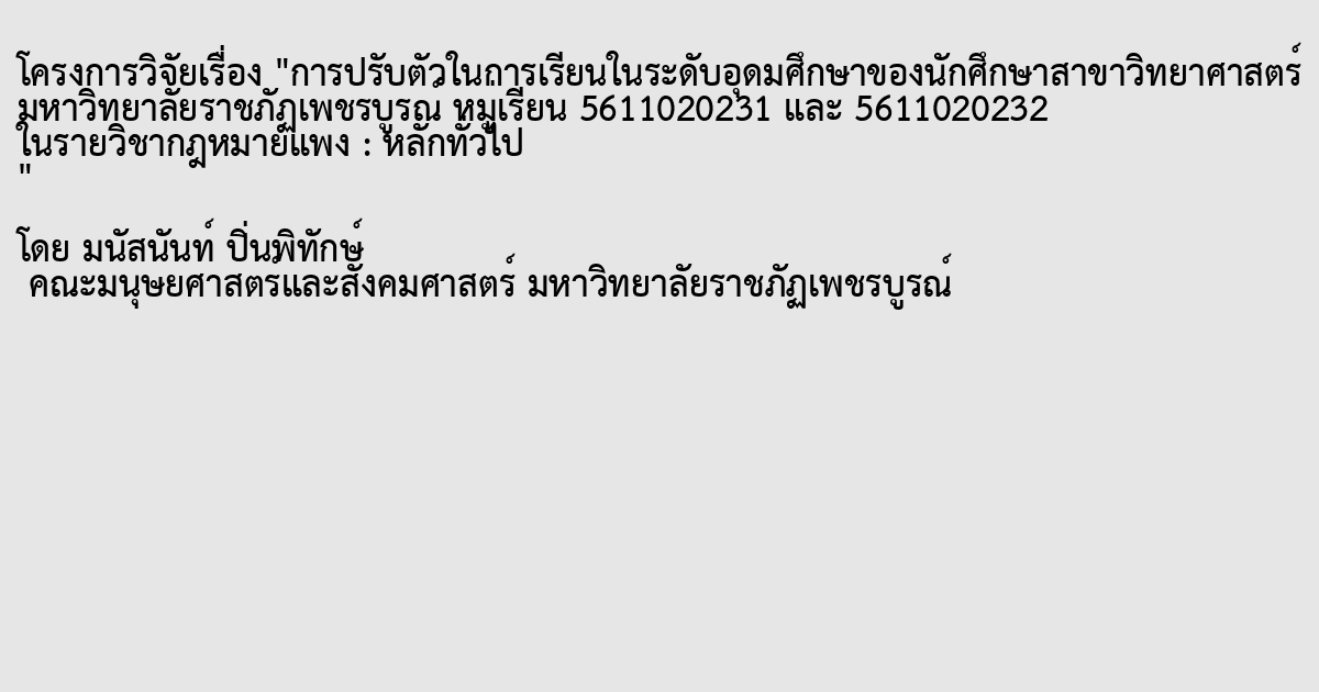 การปรับตัวในการเรียนในระดับอุดมศึกษาของนักศึกษาสาขาวิทยาศาสตร์ มหาวิทยาลัยราชภัฏเพชรบูรณ์ หมู่เรียน 5611020231 และ 5611020232 ในรายวิชากฎหมายแพ่ง : หลักทั่วไป