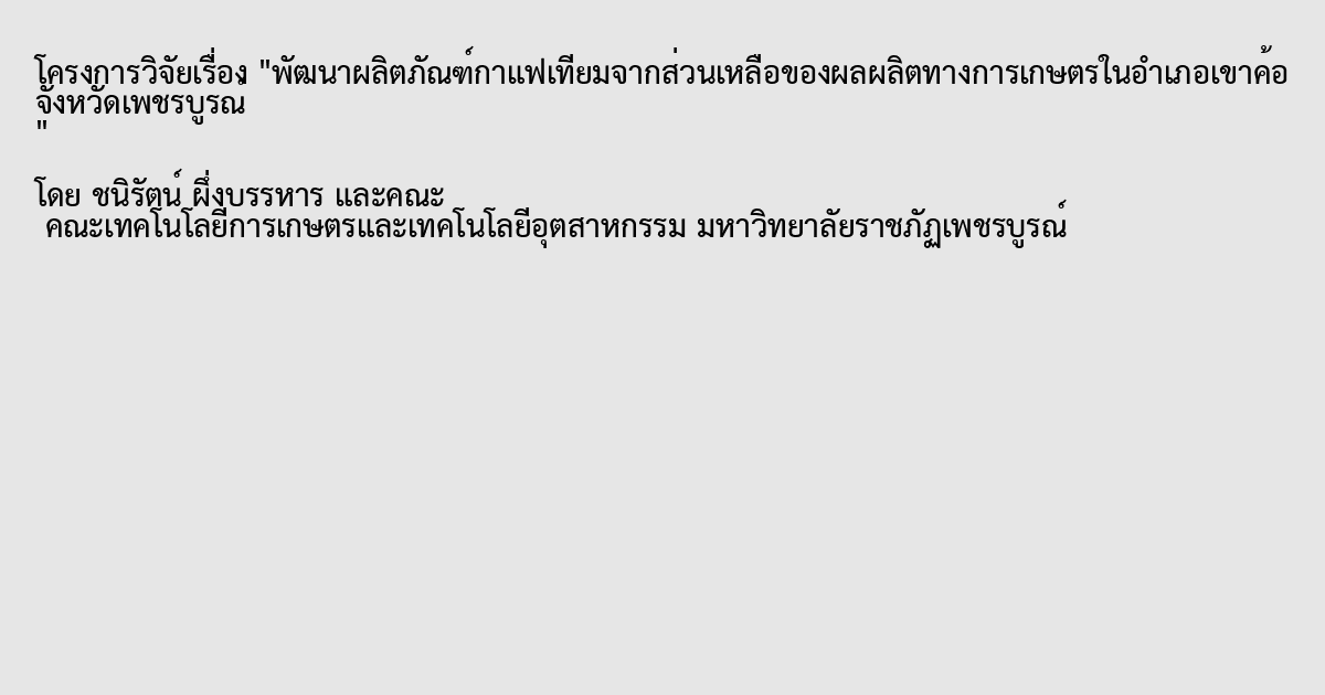 งานวิจัยนี้มีวัตถุประสงค์ เพื่อศึกษาสูตรผงกาแฟเทียมในรูปแบบกาแฟโบราณนำไปเป็นต้นแบบในการผสมส่วนเหลือของผลผลิตทางการเกษตรที่เหมาะสมต่อกาแฟเทียมในรูปแบบกาแฟโบราณที่ผู้บริโภคยอมรับ และสร้างสูตรกาแฟโบราณบรรจุขวดพร้อมดื่มจากผงกาแฟเทียมที่ทำจากส่วนเหลือของผลผลิตทางการเกษตร ในอำเภอเขาค้อ จังหวัดเพชรบูรณ์ จากการศึกษาสูตรผงกาแฟโบราณ เพื่อคัดเลือกเป็นต้นแบบ พบว่า สูตรที่ 2 (กาแฟโบราณ ตรามือ)ได้รับการยอมรับมากที่สุด ซึ่งยอมรับได้ในทุกๆคุณลักษณะ มีค่าคะแนนเฉลี่ยสูงกว่าสูตรที่1 และ3 มีความแตกต่างอย่างมีนัยสำคัญทางสถิติ (p≤0.05) แปลค่าการยอมรับในด้านสี อยู่ที่ระดับความชอบเล็กน้อย ส่วนด้านกลิ่น รสชาติ เนื้อสัมผัส และความชอบโดยรวม อยู่ที่ระดับความชอบปานกลาง เมื่อศึกษาส่วนผสมของกาแฟเทียมในรูปแบบกาแฟโบราณจากส่วนเหลือของผลผลิตทางการเกษตร ที่มี เมล็ดกาแฟ ถั่วมะแฮะ ข้าวโพด ข้าวลืมผัว และ เมล็ดมะขาม พบว่า อัตราส่วนผสมของ สูตรที่ 3 (ร้อยละ 20 : 50 : 10 : 10 : 10) มีค่าการยอมรับมากที่สุด จึงนำไปพัฒนาเป็นกาแฟโบราณบรรจุขวดพร้อมดื่มจากผงกาแฟเทียมในรูปแบบกาแฟโบราณจากส่วนเหลือของผลผลิตทางการเกษตรในอำเภอเขาค้อ จังหวัดเพชรบูรณ์ พบว่า สูตรที่ 3 ที่มีส่วนผสมของ ผงกาแฟ น้ำ น้ำตาลทราย นมข้นหวาน นมข้นจืด ที่มีอัตราส่วนผสมร้อย 3.36 83.89 4.53 5.03 และ3.19 ตามลำดับ ได้รับการยอมรับจากผู้บริโภคมากที่สุด อยู่ในระดับความชอบปานกลาง และความชอบมาก