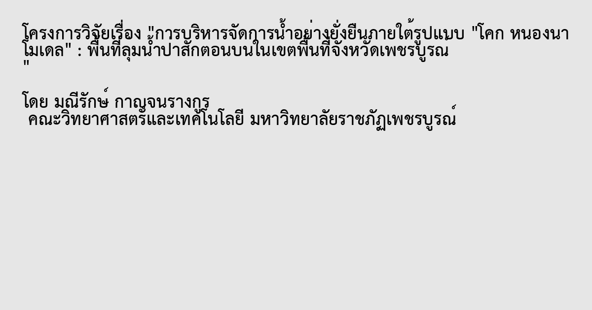 การวิจัยเรื่อง การบริหารจัดการน้ำอย่างยั่งยืน ภายใต้รูปแบบ “โคก หนอง โมเดล” : พื้นที่ลุ่มแม่น้ำป่าสักตอนบน ในเขตพื้นที่จังหวัดเพชรบูรณ์ มีวัตถุประสงค์เพื่อศึกษาศักยภาพสมาชิกเครือข่ายคนต้นน้ำ เพื่อพัฒนาศักยภาพสมาชิกเครือข่ายคนต้นน้ำ เพื่อสร้างต้นแบบการบริหารจัดการน้ำ และเพื่อประเมินผลการบริหารจัดการน้ำอย่างยั่งยืน ภายใต้รูปแบบ โคก หนอง นา โมเดล กลุ่มตัวอย่างคือ สมาชิกเครือข่ายคนต้นน้ำ พื้นที่ลุ่มแม่น้ำป่าสักตอนบนในเขตพื้นที่จังหวัดเพชรบูรณ์ จำนวน 90 คน ได้มาโดยการเจาะจงเลือกสมาชิกเครือข่ายที่มีความสนใจและสมัครใจ ใน 3 โซน คือ โซนเหนือ 30 คน โซนกลาง 30 คน และโซนใต้ 30 คน เครื่องมือที่ใช้ในการวิจัยคือ ประเด็นการสนทนากลุ่ม และแบบประเมิน สถิติที่ใช้ในการวิเคราะห์ข้อมูล ได้แก่ ค่าความถี่ ค่าร้อยละ และวิธีพรรณนาวิเคราะห์ (Descriptive Analysis)