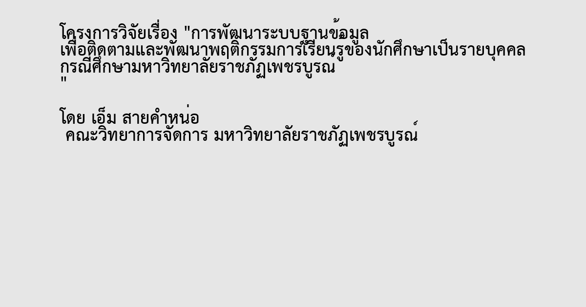 การพัฒนาระบบฐานข้อมูล เพื่อติดตามและพัฒนาพฤติกรรมการเรียนรู้ของนักศึกษาเป็นรายบุคคล กรณีศึกษามหาวิทยาลัยราชภัฏเพชรบูรณ์