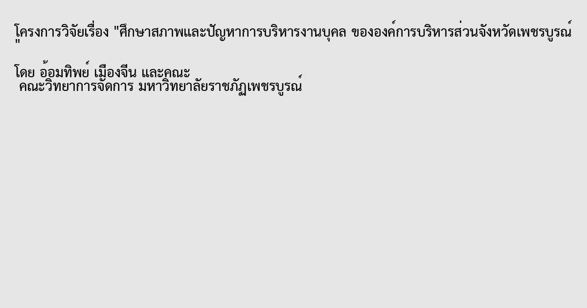 การศึกษาวิจัย เรื่อง การศึกษาสภาพและปัญหาการบริหารงานบุคคลขององค์การบริหารส่วนจังหวัดเพชรบูรณ์ ครั้งนี้ มีวัตถุประสงค์เพื่อ 1) ศึกษาสภาพการดําเนินงานในปัจจุบันขององค์การบริหารส่วนจังหวัดเพชรบูรณ์ 2) ศึกษาสภาพปัญหาของการบริหารทรัพยากรบุคคลขององค์การบริหารส่วนจังหวัดเพชรบูรณ์ 3) เพื่อศึกษาเปรียบเทียบความคิดเห็นของบุคลากรที่มีต่อสภาพปัญหาการบริหารทรัพยากรบุคคลกับปัจจัยที่เกี่ยวข้องกับการบริหารงานบุคคลขององค์การบริหารส่วนจังหวัดเพชรบูรณ์ โดยทําการศึกษากับกลุ่มเป้าหมาย 3 ระดับ คือ ระดับผู้บริหารหน่วยงาน ระดับผู้รับผิดชอบงานบริหารทรัพยากรบุคคล ของหน่วยงาน และระดับบุคลากรที่ปฏิบัติงานในหน่วยงาน และทําการศึกษารวบรวมข้อมูลโดยใช้ แบบสอบถามกับกลุ่มตัวอย่าง ซึ่งเป็นบุคลากรขององค์การบริหารส่วนจังหวัดเพชรบูรณ์ทั้ง 3 ระดับ รวมจํานวนทั้งสิ้น 461 คน และได้รับแบบสอบถามคืนมา 299 ชุด หรือร้อยละ 64.86 ผู้ศึกษานําข้อมูล ทีได้มาวิเคราะห์ทางสถิติโดยสถิติทีใช้ในการวิเคราะห์ข้อมูล คือ สถิติเชิงพรรณนา ได้แก่จํานวน ร้อยละ ค่าเฉลี่ย และส่วนเบี่ยงเบนมาตรฐาน สถิติเชิงอนุมาน โดยใช้ค่าที(t-test) และค่าสหสัมพันธ์ แบบเพียร์สัน