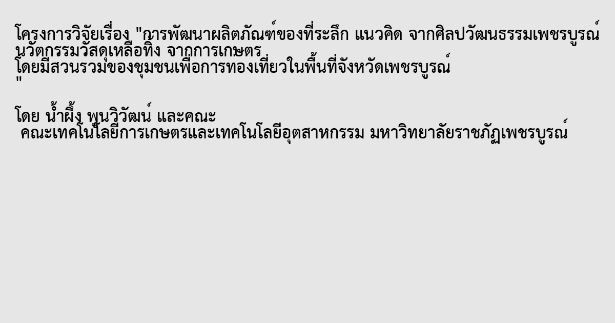 การทำวิจัยครั้งนี้มีกลุ่มตัวอย่างที่ใช้ในการวิจัยคือกลุ่มผู้ผลิตกลุ่มสตรีก้าวหน้า ตำบลสักหลง อำเภอหล่มสัก และกลุ่มดอกไม้ประดิษฐ์จากเปลือกข้าวโพด ตำบลนาเฉลียง อำเภอหนองไผ่ จังหวัดเพชรบูรณ์ ประกอบด้วยงานวิจัย3ส่วนด้วยกันคือ ส่วนที่1มีวัตถุประสงค์เพื่อสำรวจรูปแบบและความต้องการของนักท่องเที่ยว ประชาชนในพื้นที่เกี่ยวกับผลิตภัณฑ์ของที่ระลึกประเภทของใช้และของตกแต่ง ออกแบบผลิตภัณฑ์ของที่ระลึกประเภทของใช้และของตกแต่งโดยใช้แนวคิดเกี่ยวกับศิลปวัฒนธรรมจังหวัดเพชรบูรณ์นวัตกรรมเศษชีวมวลจากวัสดุเหลือทิ้งทางการเกษตร ที่มีลักษณะโดยรวมตามมาตรฐานผลิตภัณฑ์ชุมชน มผช. 236/2547และประเมินความพึงพอใจผลิตภัณฑ์ของที่ระลึกตามหลักเกณฑ์การให้คะแนน มผช. 236/2547 ส่วนที่2 มีวัตถุประสงค์เพื่อศึกษาทดลองผลิตเศษชีวมวล จากวัสดุเหลือทิ้งทางการเกษตร สี่ชนิดได้แก่ ฟางข้าว ต้นและเปลือกข้าวโพด ชานอ้อยและใบอ้อย เปลือกมะขาม เพื่อให้ได้ส่วนผสมที่เหมาะสมกับการขึ้นรูปเป็นผลิตภัณฑ์ของที่ระลึก นำเศษชีวมวลจากวัสดุเหลือทิ้งจากการเกษตรพัฒนาให้มีเพิ่มมูลค่าเพิ่มและเ พื่อทดสอบคุณสมบัติทางกายภาพของวัสดุชีวมวลจากวัสดุเหลือทิ้งจากการเกษตร ตามมาตรฐาน JIS 5906-1983 และในส่วนที่3มีวัตถุประสงค์เพื่อพัฒนาเครื่องขึ้นรูปและแม่พิมพ์สำหรับใช้ขึ้นรูปสินค้าของที่ระลึกจากวัสดุเหลือทิ้งทางการเกษตร ทดสอบสมรรถนะเครื่องขึ้นรูปและแม่พิมพ์ และ ประเมินความคิดเห็นของผู้ใช้เครื่องขึ้นรูปและแม่พิมพ์ในการขึ้นรูปสินค้าของที่ระลึก