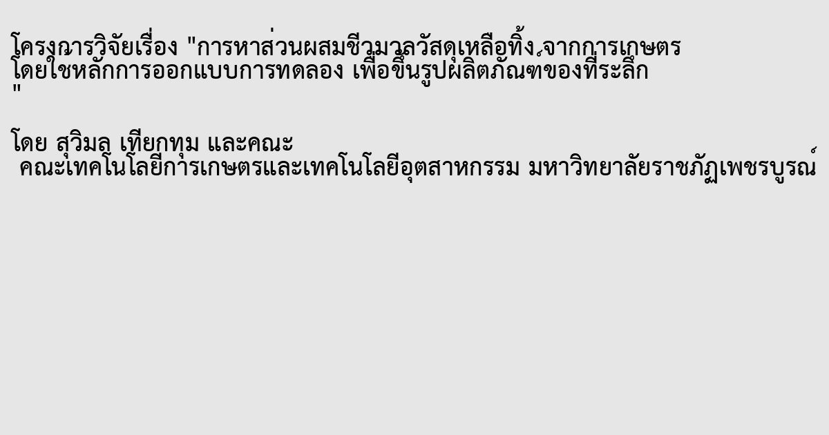 การวิจัยครั้งนี้มีวัตถุประสงค์เพื่อศึกษาทดลองผลิตเศษชีวมวล จากวัสดุเหลือทิ้งทางการเกษตรประกอบด้วย ฟางข้าว ต้นและเปลือกข้าวโพด ชานอ้อย รกมะขาม เพื่อให้ได้ส่วนผสมที่เหมาะสมกับการขึ้นรูปเป็นผลิตภัณฑ์ของที่ระลึก เพื่อนำเศษชีวมวลจากวัสดุเหลือทิ้งจากการเกษตร พัฒนาให้มีเพิ่มมูลค่าเพิ่มและเพื่อทดสอบคุณสมบัติทางกายภาพ วัสดุชีวมวลจากวัสดุเหลือทิ้งจากการเกษตร ตามมาตรฐาน มอก.876 - 2547 ด้านปริมาณความชื้น การขยายตัวเมื่อดูดซับความชื้น และความหนาแน่น จากการทดลอง พบว่าปริมาณที่เหมาะสมสำหรับเศษวัสดุเหลือทิ้งทางการเกษตร ได้แก่ ฟางข้าว,รกมะขาม,ชานอ้อย,ใบและต้นข้าวโพด ใช้ในอัตราส่วนผสมในช่วง 80 –90 กรัม และปริมาณกาวน้ำยางพาราพรีวัลคาไนซ์ และกาวยูเรียฟอมัลดีไฮด์อยู่ในช่วง 100-130 กรัม ผลการทดสอบคุณสมบัติทางกายภาพของแผ่นอัดจากเศษวัสดุเหลือทิ้งทางการเกษตร พบว่าแผ่นอัดจากฟางข้าวสูตรที่ 3 แผ่นอัดจากรกมะขามสูตรที่3 แผ่นอัดจากใบและต้นข้าวโพดและแผ่นอัดจากชานอ้อย มีค่าความหนาแน่นเท่ากับ 580.67 g/mm3, 644.26 g/mm3 495.05 g/mm3 และ599.45 g/mm3 ตามลำดับ ค่าความชื้นมีค่าอยู่ในช่วง 5-7% และค่าการบวมน้ำของแผ่นอัดเศษวัสดุ จากฟางข้าว,รกมะขาม,ชานอ้อย,ใบและต้นข้าวโพด มีค่าเป็น 3.6 mm., 0.5mm., 0.9 mm. และ 1 mm. ตามลำดับ จากข้อมูลดังกล่าวสามารถนำเศษวัสดุไปพัฒนาเพื่อขึ้นรูปเป็นผลิตภัณฑ์ได้ต่อไป