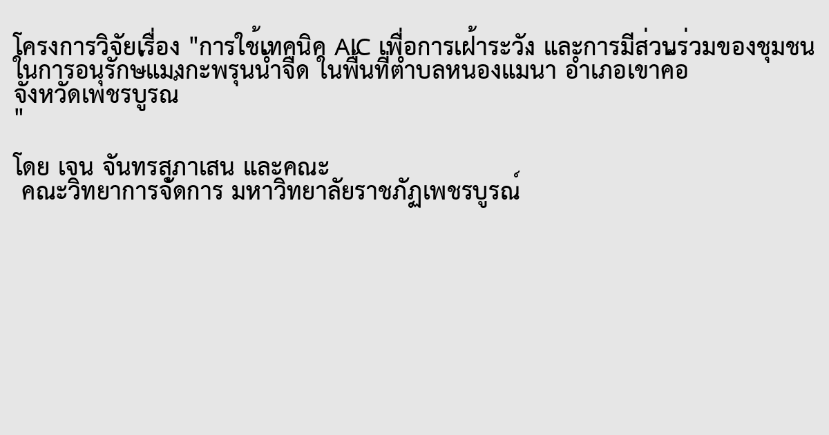 ของชุมชนในการอนุรักษ์แมงกะพรุนน้ำจืดในพื้นที่ ตำบลหนองแม่นา อำเภอเขาค้อ จังหวัดเพชรบูรณ์ กลุ่มตัวอย่าง ได้แก่ กลุ่มชุมชนคนรักษ์ป่า ตำบลหนองแม่นา อำเภอเขาค้อ จังหวัดเพชรบูรณ์ ในการเลือกตัวอย่างใช้วิธีการสุ่มแบบจำเพาะเจาะจง (Purposive sampling) จำนวน 30 คน เก็บข้อมูลด้วยแบบสัมภาษณ์แบบเจาะลึก (In-depth Interview) และนำข้อมูลที่ได้มาจัดระบบข้อมูลหาความสอดคล้องเชิงเนื้อหา และนำเสนอข้อมูลเชิงพรรณนา ใช้ระยะเวลาดำเนินการ 6 เดือน จากผลการวิจัย พบว่าชาวบ้านมีระดับการมีส่วนร่วมในระดับมาก โดยชาวบ้านมีส่วนร่วมในด้านการมีส่วนร่วมในการตัดสินใจของชาวบ้านสูงสุด แสดงให้เห็นว่าชาวบ้านมีจิตสำนึกในการเข้ามามีส่วนร่วมในการเสนอทางเลือกและปรึกษาหารือ แนวทางการแก้ไขปัญหา กำหนดระเบียบ หลักเกณฑ์ต่าง ๆ ในการจัดการป่าชุมชน การพัฒนาการมีส่วนร่วมของประชาชนในการอนุรักษ์จากกระบวนการ AIC ทำให้ชาวบ้านตระหนักและปรับเปลี่ยนบริบทของการพัฒนาป่าชุมชนและการอนุรักษ์แมงกะพรุนน้ำจืด ด้วยการวางแผนอย่างมีส่วนร่วม ร่วมกันกำหนดแนวคิดการดำเนินการอนุรักษ์แหล่งน้ำเข็ก และเรียนรู้อย่างสอดคล้องกับ การอนุรักษ์จากกระบวนการ AIC เกิดความคิดสร้างสรรค์อย่างมีส่วนร่วมและเกิดพลังชุมชนอย่างมาก