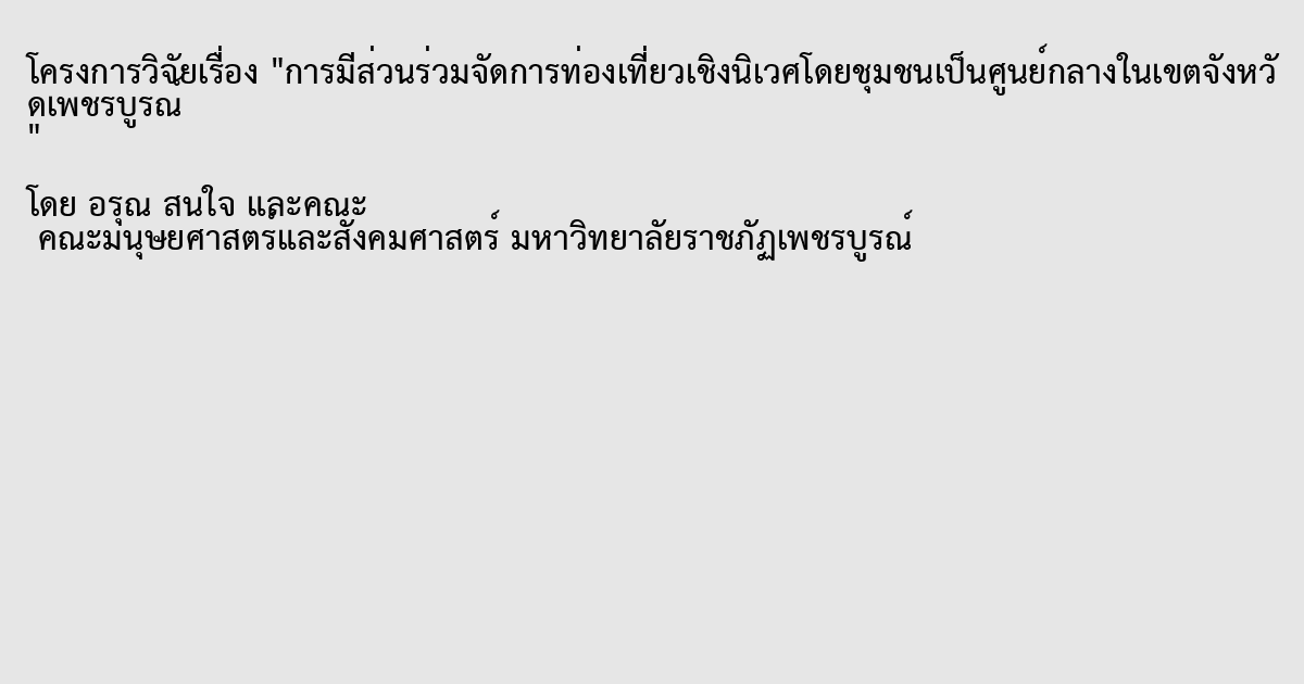 การศึกษาครั้งนี้ มีวัตถุประสงค์เพื่อวิเคราะห์การมีส่วนร่วมของชุมชนในการบริหารจัดการแหล่งท่องเที่ยวอย่างยั่งยืน และวิเคราะห์ความสัมพันธ์ระหว่างลักษณะส่วนบุคคล/สถานภาพกับการมีส่วนร่วมของชุมชนในการบริหารจัดการแหล่งท่องเที่ยวอย่างยั่งยืนในจังหวัดเพชรบูรณ์ ตามหลักการท่องเที่ยวเชิงนิเวศ และวิเคราะห์ผลจากการมีส่วนร่วมของชุมชนในการบริหารจัดการแหล่งท่องเที่ยวอย่างยั่งยืนในจังหวัดเพชรบูรณ์ ตามหลักการท่องเที่ยวเชิงนิเวศ กลุ่มตัวอย่างเชิงปริมาณ ได้แก่ ประชาชนที่มีภูมิลาเนาอยู่ในอาเภอเขาค้อ จังหวัดเพชรบูรณ์ ได้กลุ่มตัวอย่าง 400 คน โดยใช้การสัมภาษณ์กลุ่มตัวอย่างผู้ให้ข้อมูลสาคัญในการวิจัยเชิงคุณภาพด้วยการสุ่มแบบเฉพาะเจาะจง (purposive sampling) จานวน 7 คน และประเมินผล “การมีส่วนร่วมของชุมชน” ในการบริหารจัดการแหล่งท่องเที่ยว โดยการสนทนากลุ่ม (Focus Group Discussion) ของผู้นาชุมชน ประชาชน ผู้ประกอบกิจการท่องเที่ยวเชิงนิเวศ จานวนกลุ่มตัวอย่างทั้งสิ้น 30 คน เครื่องมือที่ใช้ในการวิจัย คือแบบสอบถามและสัมภาษณ์ สถิติที่ใช้ คือ ร้อยละ ค่าเฉลี่ย ค่าสัมประสิทธิ์สหสัมพันธ์เพียร์สัน (Pearson's Correlation Coefficient) และการสังเคราะห์เนื้อหาการจัดลาดับการมีส่วนร่วม