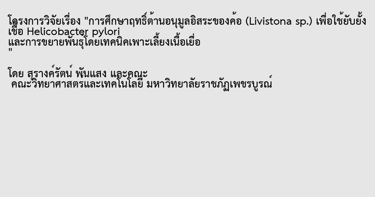 ฤทธิ์ต้านอนุมูลอิสระ,ค้อ,เชื้อ Helicobacter pylori,การขยายพันธุ์โดยเทคนิคเพาะเลี้ยงเนื้อเยื่อ,antioxidants efficiency,Livistona sp.,Helicobacter pylori,tissue culture propagation