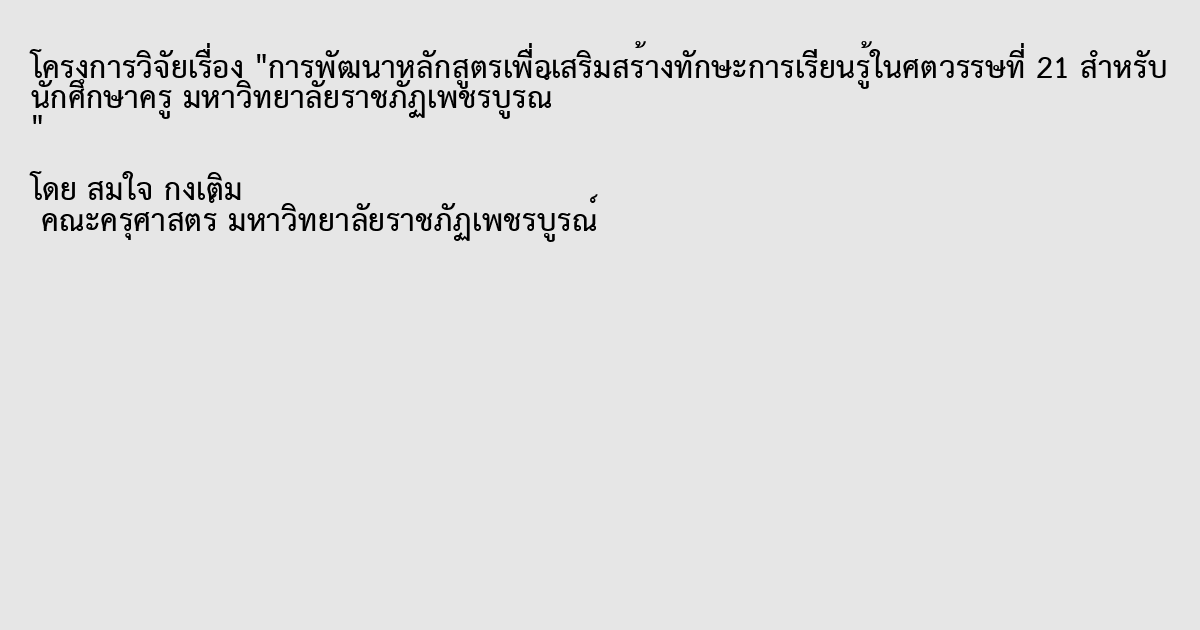 จากการวิจัยเรื่องการพัฒนาหลักสูตรเพื่อเสริมสร้างทักษะการเรียนรู้ในศตวรรษที่ 21 สำหรับนักศึกษาครู มหาวิทยาลัยราชภัฏเพชรบูรณ์สรุปผลการวิจัยได้ดังนี้