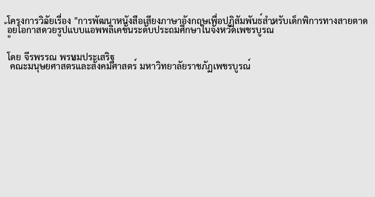 การพัฒนาหนังสือเสียงภาษาอังกฤษเพื่อปฏิสัมพันธ์สำหรับเด็กพิการทางสายตาด้อยโอกาสด้วยรูปแบบแอพพลิเคชั่นระดับประถมศึกษาในจังหวัดเพชรบูรณ์