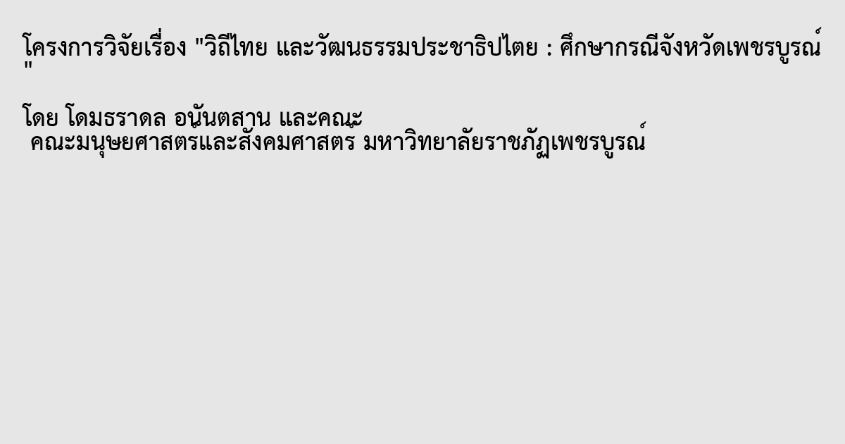 การวิจัยเรื่อง วิถีไทย และ วัฒนธรรมประชาธิปไตย : ศึกษากรณีจังหวัดเพชรบูรณ์โดยมีวัตถุประสงค์เพื่อ 1) เพื่อศึกษาทัศนคติ วิถีชีวิตวัฒนธรรมคนไทยกับวัฒนธรรมประชาธิปไตยในเขตพื้นที่จังหวัดเพชรบูรณ์ 2)เพื่อศึกษาอิทธิพลวัฒนธรรมที่มีต่อทัศนคติความเชื่อทางประชาธิปไตยของประชากร