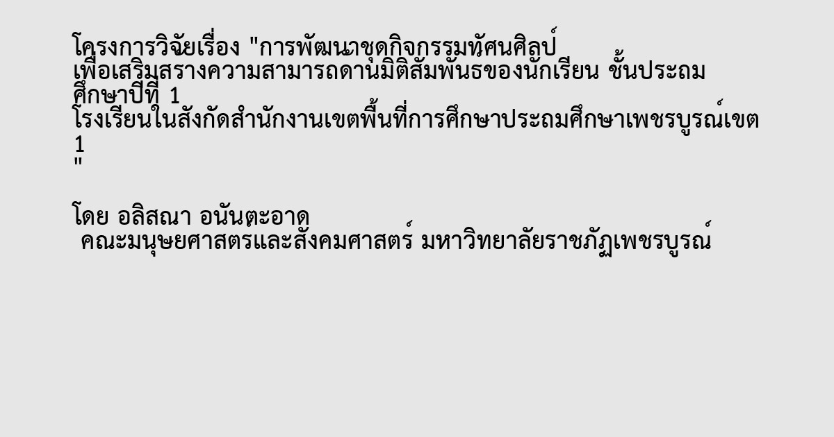 การพัฒนาชุดกิจกรรมทัศนศิลป์ เพื่อเสริมสร้างความสามารถด้านมิติสัมพันธ์ของนักเรียน ชั้นประถม ศึกษาปีที่ 1 โรงเรียนในสังกัดสำนักงานเขตพื้นที่การศึกษาประถมศึกษาเพชรบูรณ์เขต 1