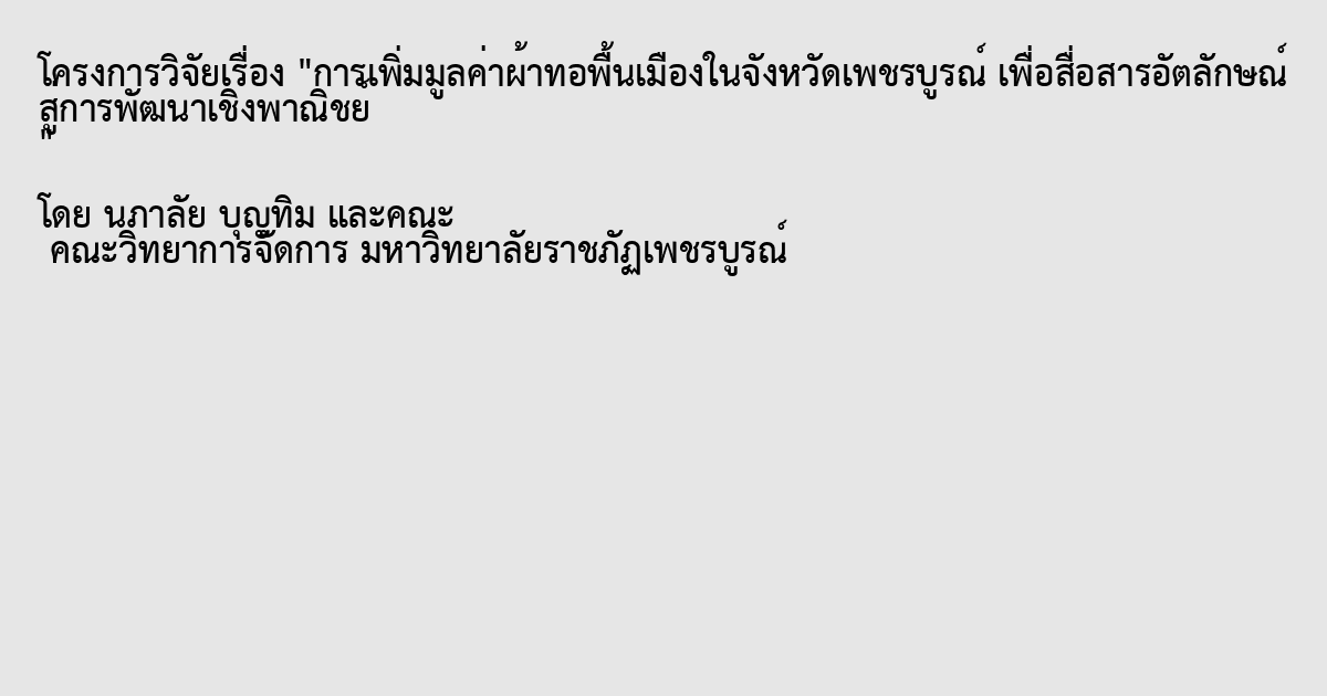 งานวิจัยนี้นำเสนอการเพิ่มมูลค่าผ้าทอพื้นเมืองในจังหวัดเพชรบูรณ์เพื่อสื่อสารอัตลักษณ์สู่การพัฒนาเชิงพาณิชย์โดยมีวัตถุประสงค์ ดังนี้ (1) ศึกษาอัตลักษณ์ผ้าทอพื้นเมืองในจังหวัดเพชรบูรณ์ (2) ศึกษาต้นทุนและผลตอบแทนผ้าทอพื้นเมืองในจังหวัดเพชรบูรณ์ (3) พัฒนาผลิตภัณฑ์ผ้าทอพื้นเมืองในจังหวัดเพชรบูรณ์ (4) ศึกษาความเป็นไปได้ในการรวมกลุ่มเครือข่ายธุรกิจ (Cluster) ผ้าทอพื้นเมืองในจังหวัดเพชรบูรณ์ (5) ศึกษาการสื่อสารอัตลักษณ์ผ้าทอพื้นเมืองในจังหวัดเพชรบูรณ์ด้วยกลยุทธ์การประชาสัมพันธ์ทางการตลาด โดยใช้แบบสอบถามและแบบสัมภาษณ์แบบมีโครงสร้างในการเก็บรวบรวมข้อมูลจากกลุ่มผ้าทอพื้นเมืองไทหล่ม ในอำเภอหล่มสัก และอำเภอหล่มเก่า จังหวัดเพชรบูรณ์ จำนวน 6 กลุ่ม ประกอบด้วย กลุ่มทอผ้าไทหล่มบ้านหวาย กลุ่มทอผ้าฝ้ายบ้านติ้ว กลุ่มทอผ้ากี่กระตุกบ้านวังร่อง กลุ่มทอผ้าวัดศรีฐานวังบาล กลุ่มทอผ้าบ้านอีเลิศ กลุ่มทอผ้าบ้านภูผักไซ่ วิเคราะห์ข้อมูลในลักษณะเชิงพรรณนา การแจกแจงความถี่ ค่าร้อยละ ค่าเฉลี่ย ส่วนเบี่ยงเบนมาตรฐาน การคำนวณต้นทุนและผลตอบแทน