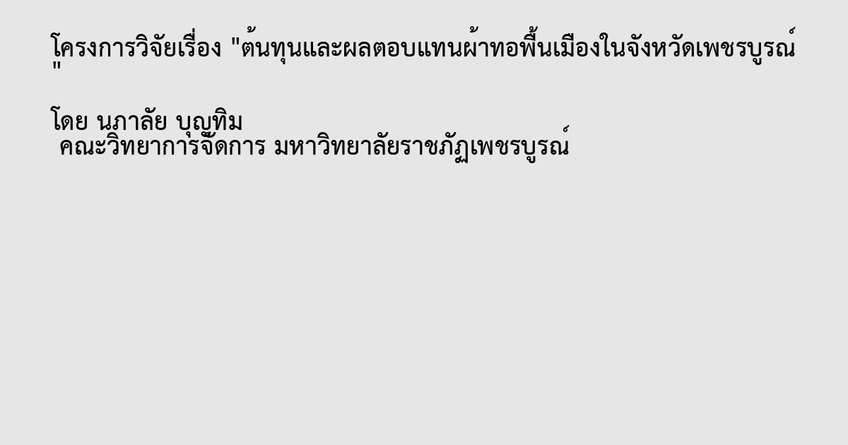 งานวิจัยนี้นำเสนอต้นทุนและผลตอบแทนผ้าทอพื้นเมืองในจังหวัดเพชรบูรณ์ โดยมี วัตถุประสงค์ ดังนี้ 1) ศึกษาประวัติและกระบวนการทอผ้าพื้นเมือง 2) ศึกษาต้นทุนและผลตอบแทนผ้าทอพื้นเมือง โดยใช้แบบสอบถามในการเก็บรวบรวมข้อมูลจากกลุ่มผ้าทอพื้นเมืองไทหล่ม ในอำเภอหล่มสัก และอำเภอหล่มเก่า จังหวัดเพชรบูรณ์ จำนวน 6 กลุ่ม ประกอบด้วย กลุ่มทอผ้าไทหล่มบ้านหวายกลุ่มทอผ้าฝ้ายบ้านติ้ว กลุ่มทอผ้ากี่กระตุกบ้านวังร่อง กลุ่มทอผ้าวัดศรีฐานวังบาล กลุ่มทอผ้าบ้านอีเลิศ และกลุ่มทอผ้าบ้านภูผักไซ่ ด้วยวิธีการเก็บข้อมูลแบบเจาะจง สำหรับการวิเคราะห์ข้อมูลจะแสดงผลด้วยการแจกแจงความถี่ ค่าร้อยละ การคำนวณต้นทุน รายได้ กำไร(ขาดทุน) อัตราผลตอบแทนต่อยอดขาย ระยะเวลาคืนทุน และอัตราผลตอบแทนต่อต้นทุน