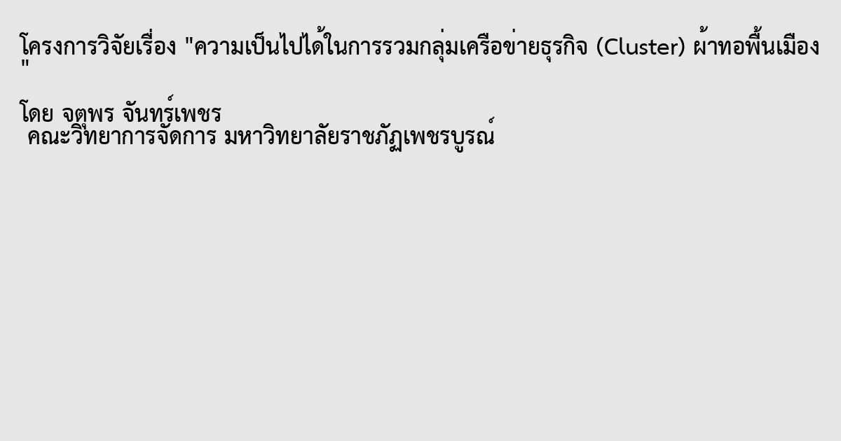 The purpose of this research is to study the possibility to combine business networking groups of Hua-Daeng-Teen-Gan Sarong weaver in Petchabun province and the competition of Hua-Daeng-Teen-Gan Sarong market in Petchabun province. This study collected data via questionnaire from the 6 groups of Hua-Daeng-Teen-Gan Sarong weaver in Lom Sak and Lom Kao District. The statistic tools used were percentage, frequency, average, and standard deviation.