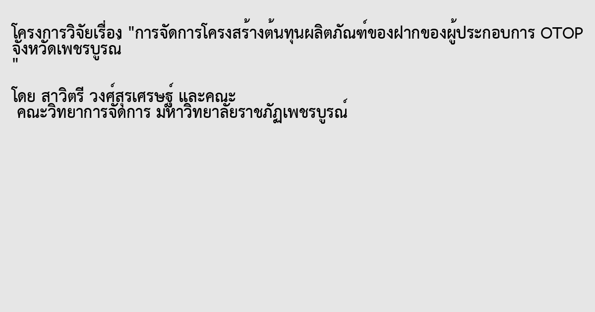 การวิจัยครั้งนี้ มีวัตถุประสงค์เพื่อศึกษาสภาพทั่วไปของกลุ่มผลิตภัณฑ์ประเภทของฝากของผู้ประกอบการ OTOP และเพื่อวิเคราะห์โครงสร้างต้นทุนผลิตภัณฑ์ประเภทของฝากให้กับผู้ประกอบการ OTOP โดยเก็บข้อมูลจากการใช้แบบสอบถามและการสัมภาษณ์สมาชิกของกลุ่มเกษตรกรที่ผลิตมะขามแช่อิ่ม อำเภอหล่มเก่า จังหวัดเพชรบูรณ์ จำนวน 72 ราย จากการรวบรวมข้อมูล หนังสือ งานวิจัยที่เกี่ยวข้อง โดยนำข้อมูลที่ได้ มาทำการวิเคราะห์โดยใช้ค่าเฉลี่ยและร้อยละ พบว่า กลุ่มเกษตรกรที่ผลิตมะขามแช่อิ่มส่วนใหญ่ประกอบกิจการมาแล้วมากกว่า 2 ปี มีแหล่งที่มาของความรู้จากการศึกษาด้วยตนเอง ปัญหาและอุปสรรคที่พบ คือ มีการแข่งขันกันสูงและต้องการการสนับสนุนจากรัฐบาลในเรื่องของแหล่งความรู้และเทคนิคการผลิต