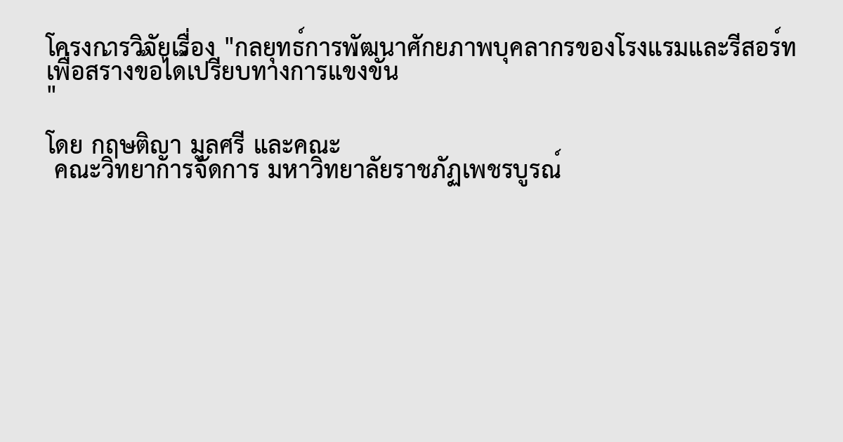 งานวิจัยนี้มีวัตถุประสงค์ เพื่อ 1) ศึกษาแนวทางการพัฒนาศักยภาพของบุคลากรโรงแรมและรีสอร์ท 2) ศึกษาความพึงพอใจของลูกค้าต่อการให้บริการของบุคลากรโรงแรมและรีสอร์ท และ 3) นำเสนอกลยุทธ์ความสำเร็จในการพัฒนาศักยภาพของบุคลากรโรงแรมและรีสอร์ท ผู้ให้ข้อมูลหลักในการศึกษาครั้งนี้ คือ บุคลกรภาคธุรกิจโรงแรมและรีสอร์ท อำเภอเขาค้อ จังหวัดเพชรบูรณ์ จำนวน 35 คน และกลุ่มผู้ที่เกี่ยวข้องจำนวน 7 คน กลุ่มตัวอย่างในการวิจัยเชิงปริมาณคือ ลูกค้าที่เข้าพักโรงแรมและ รีสอร์ท อำเภอเขาค้อ จังหวัดเพชรบูรณ์ จำนวน 400 คน เครื่องมือที่ใช้ในการเก็บรวบรวมข้อมูลคือ แบบประเมินศักยภาพ การสัมภาษณ์เชิงลึก และแบบสอบถาม สถิติที่ใช้ในการวิเคราะห์ได้แก่ ร้อยละ ค่าเฉลี่ย ส่วนเบี่ยงเบนมาตรฐาน ค่าสัมประสิทธิสหสัมพันธ์เพียร์สัน และการวิเคราะห์ปัจจัยเชิงสำรวจ ผลการวิจัยพบว่า
