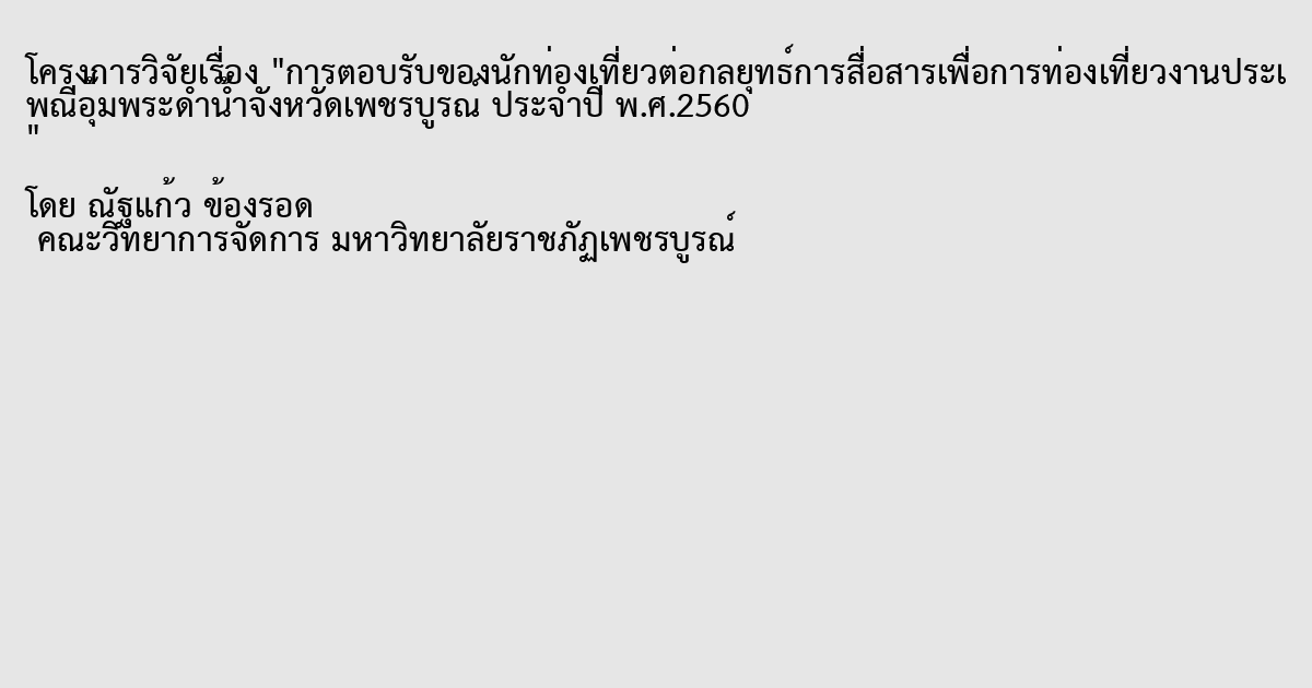 การวิจัยครั้งนี้มีวัตถุประสงค์ เพื่อศึกษาการวางกลยุทธ์สื่อสารเพื่อการท่องเที่ยวงานประเพณีอุ้มพระดำน้ำจังหวัดเพชรบูรณ์ประจำปีพ.ศ.2560 ศึกษาการตอบรับการรับรู้/การเข้าถึงสื่อที่ใช้ในแต่ละประเภทของงานประเพณีอุ้มพระดำน้ำจังหวัดเพชรบูรณ์ประจำปีพ.ศ.2560 ประเมินเนื้อหาของสื่อที่กลุ่มนักท่องเที่ยวจดจำได้ของงานประเพณีอุ้มพระดำน้ำจังหวัดเพชรบูรณ์ประจำปีพ.ศ.2560 และศึกษาแนวทางในการวางแผนกลยุทธ์การสื่อสารเพื่อประชาสัมพันธ์การท่องเที่ยวงานประเพณีอุ้มพระดำน้ำ จังหวัดเพชรบูรณ์ในปีต่อ ๆ ไป
