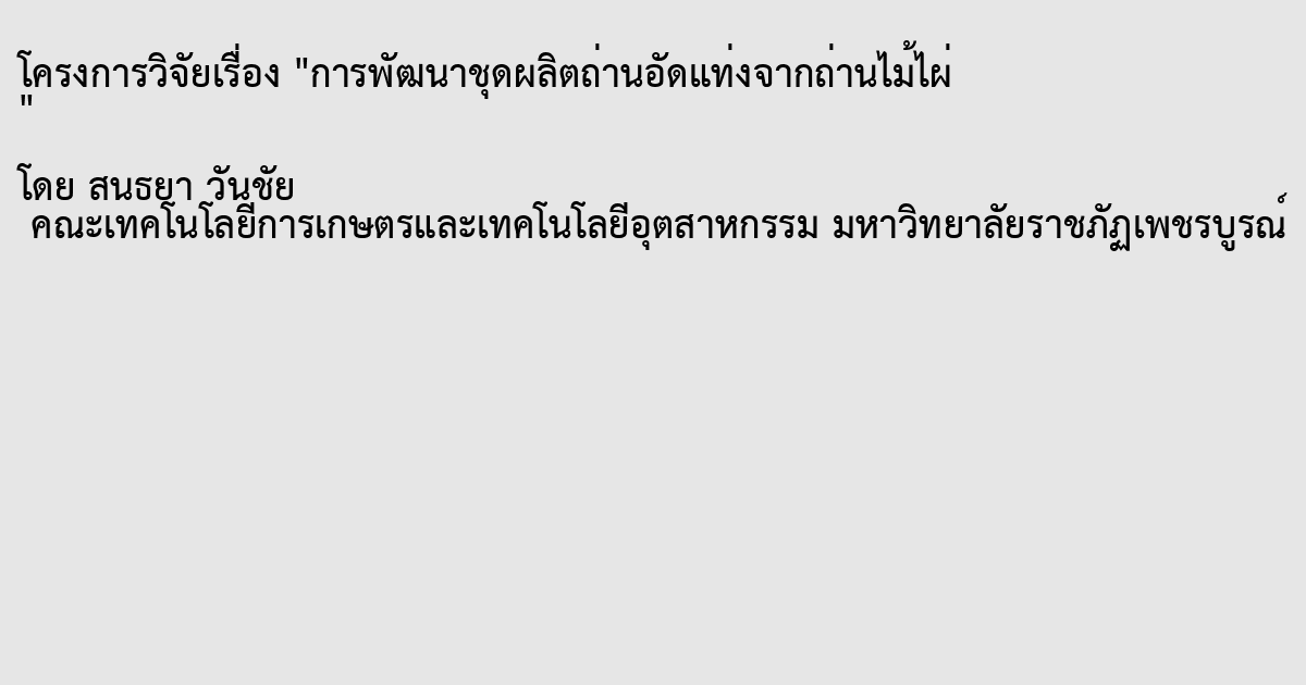รายงานการวิจัยเรื่องการพัฒนาชุดผลิตถ่านอัดแท่งจากถ่านไม้ไผ่ มีวัตถุประสงค์เพื่อศึกษาการสร้างชุดผลิตถ่านอัดแท่งจากพืชพลังงานถ่านไม้ไผ่และหาแนวทางการผลิตถ่านอัดแท่งจากพืชพลังงานถ่านไม้ไผ่ เครื่องมือที่ใช้ในการวิจัยแบ่งออกเป็น 1. ชุดผลิตถ่านอัดแท่งจากไม้ไผ่ และ 2. ตารางบันทึกค่าผลการวัดค่าปริมาณความร้อน เวลาในการเผาไหม้ เถ้าและค่าความชื้น