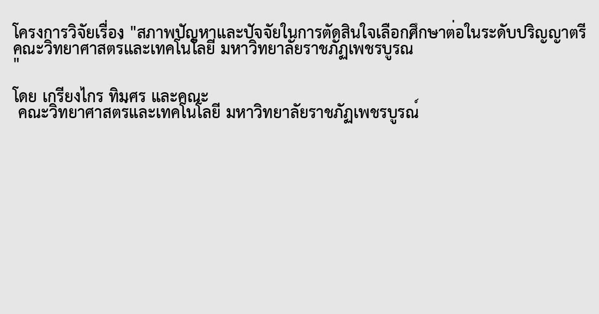การวิจัยครั้งนี้มีวัตถุประสงค์เพื่อสภาพปัญหาและปัจจัยในการตัดสินใจเลือกศึกษาต่อในระดับปริญญาตรี กลุ่มประชากร คือ นักเรียนระดับชั้นมัธยมศึกษาตอนปลายในจังหวัดเพชรบูรณ์ สุ่มเลือกกลุ่มตัวอย่างที่ไม่เป็นไปตามโอกาสทางสถิติ (Non - Probability Sampling) และตัวอย่างจำนวนนักเรียนที่พบในกิจกรรมต่าง ๆ ของโรงเรียน ได้กลุ่มตัวอย่างจำนวน 167 คน โดยใช้วิธีการสุ่มแบบบังเอิญ (Accidental sampling) จากนั้นวิเคราะห์ข้อมูลแสดงผลในสถิติพรรณนา (Descriptive statistics) ได้แก่ ความถี่ ร้อยละ และค่าเฉลี่ย จากผลการวิจัย พบว่า ปัจจัยในการตัดสินใจศึกษาต่อในคณะวิทยาศาสตร์และเทคโนโลยี มหาวิทยาลัยราชภัฏเพชรบูรณ์ ผู้ตอบแบบสอบถามเป็นนักเรียนชั้นมัธยมศึกษาตอนปลาย จากผลการวิจัยพบว่า ปัจจัยในการตัดสินใจศึกษาต่อในระดับปริญญาตรีมีค่าเฉลี่ยความคิดเห็นมากที่สุดคือ ด้านคุณภาพของของอาจารย์และนักศึกษา รองลงมาคือ ด้านหลักสูตร ด้านความตั้งใจส่วนตัว ด้านทําเลที่ตั้งของสถานศึกษา ด้านการตลาดและประชาสัมพันธ์ ด้านการตลาดและประชาสัมพันธ์ ด้านภาพลักษณ์ของมหาวิทยาลัยฯ ด้านแรงจูงใจทางสังคม และด้านบุคคลที่เกี่ยวข้องกับนักเรียน ครู เพื่อน รุ่นพี่ ศิษย์เก่า ผู้ปกครอง ตามลำดับ