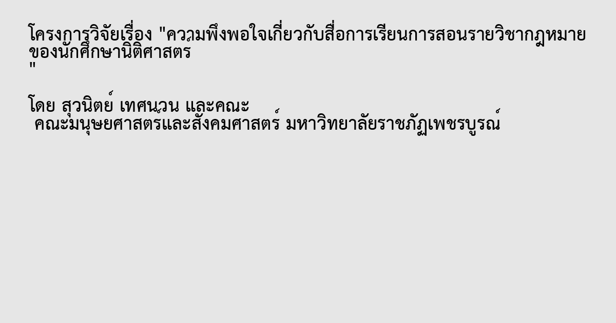 การวิจัยครั้งนี้มีวัตถุประสงค์เพื่อศึกษาความพึงพอใจเกี่ยวกับสื่อการเรียนการสอนรายวิชากฎหมายของ นักศึกษานิติศาสตร์ สาขาวิชานิติศาสตร์ คณะมนุษยศาสตร์และสังคมศาสตร์ มหาวิทยาลัยราชภัฏเพชรบูรณ์ โดยเลือกจากประชากรกลุ่มเป้าหมาย คือ นักศึกษานิติศาสตร์ ชั้นปีที่ 1 ภาคการศึกษาที่ 22560 จำนวน 57 คน และวิธีการเลือกสุ่มตัวอย่างเพื่อสัมภาษณ์เชิงลึกจากนักศึกษากลุ่มเป้าหมายเดิม เครื่องมือที่ใช้ในการเก็บรวบรวมข้อมูล คือ แบบสอบถามความพึงใจเกี่ยวกับสื่อการเรียนการสอนรายวิชากฎหมายของนักศึกษา นิติศาสตร์ สถิติที่ใช้ในการวิเคราะห์ข้อมูล ได้แก่ ค่าร้อยละ ค่าเฉลี่ย และส่วนเบี่ยงเบนมาตรฐาน ข้อมูลสถิติ จากคำถามปลายเปิดและการแปลค่าจากการสัมภาษณ์เชิงลึก