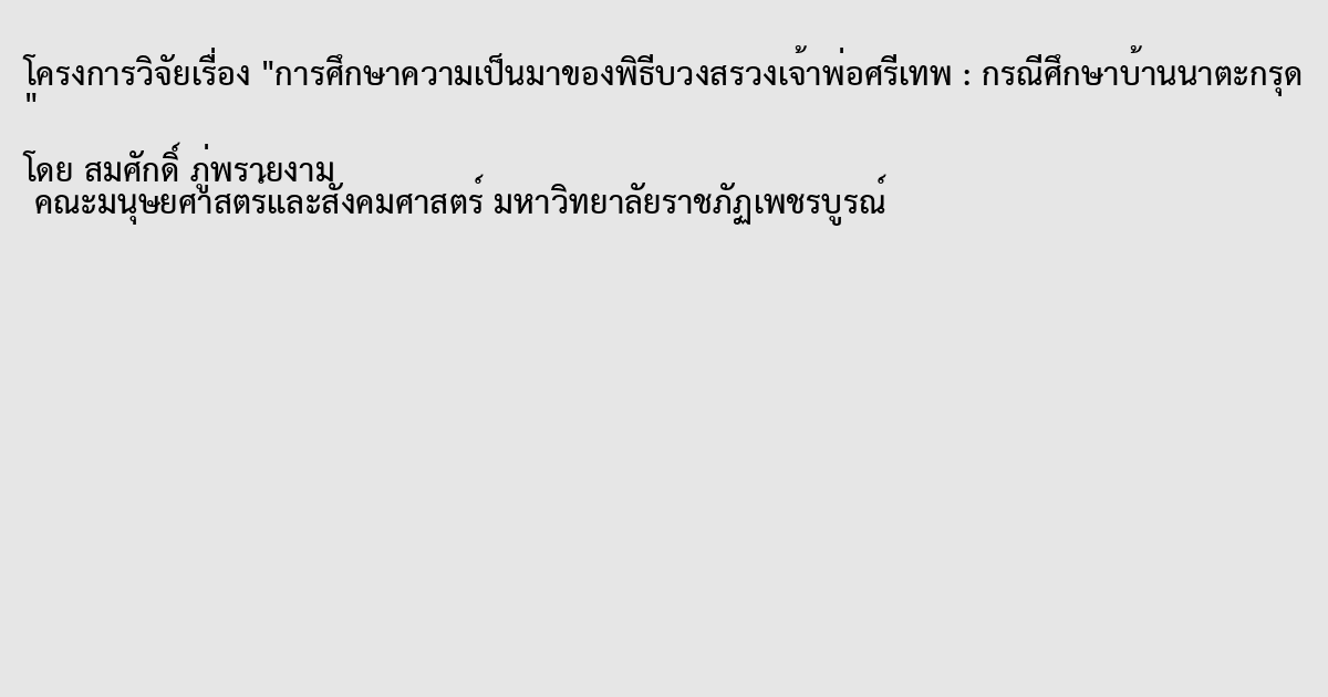 การศึกษาค้นคว้าด้วยตนเอง เรื่อง ความเป็นมาของพิธีบวงสรวงเจ้าพ่อศรีเทพ เป็นการวิจัยเชิงคุณภาพ มีวัตถุประสงค์เพื่อศึกษาประวัติความเป็นมา องค์ประกอบของพิธีบวงสรวงเจ้าพ่อศรีเทพ ตำบลศรีเทพน้อย อำเภอศรีเทพ จังหวัดเพชรบูรณ์ โดยใช้กระบวนการทางประวัติศาสตร์ ศึกษาข้อมูลจากเอกสารและงานวิจัยที่เกี่ยวข้อง และจัดเก็บข้อมูลภาคสนามด้วยการสังเกตการณ์อย่างมีส่วนร่วมและการสัมภาษณ์ แล้วนำเสนอข้อมูลแบบพรรณนาวิเคราะห์พบว่า