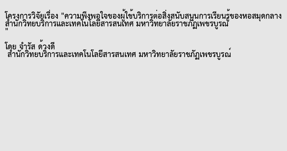 การวิจัยครั้งนี้ มีวัตถุประสงค์เพื่อศึกษาความพึงพอใจของผู้ใช้บริการต่อสิ่งสนับสนุนการเรียนรู้ของหอสมุดกลาง สำนักวิทยบริการและเทคโนโลยีสารสนเทศ มหาวิทยาลัยราชภัฏเพชรบูรณ์ตลอดจนศึกษาปัญหาและข้อเสนอแนะของอาจารย์ นักศึกษาภาคปกติ นักศึกษา ภาค กศ.ปช. โดยใช้แบบสอบถามเป็นเครื่องมือรวบรวมข้อมูลจากอาจารย์ นักศึกษาภาคปกติ จำนวน 362 คน เครื่องมือที่ใช้เป็นแบบสอบถาม การวิเคราะห์ข้อมูลใช้สถิติ ร้อยละ ค่าเฉลี่ย และส่วนเบี่ยงเบนมาตรฐาน โดยศึกษาความพึงพอใจจากองค์ประกอบ 3 ด้าน ได้แก่ ด้านทรัพยากรสนับสนุนการเรียนรู้ ด้านสถานที่/สิ่งอำนวยความสะดวก และด้านการบริการและให้คำปรึกษา ผลการวิจัยพบว่า