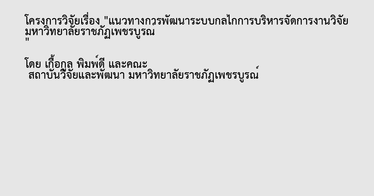 การวิจัยครั้งนี้มีวัตถุประสงค์เพื่อศึกษาสภาพปัจจุบันและความต้องการเกี่ยวกับการพัฒนาระบบกลไกการบริหารจัดการงานวิจัย และนำข้อมูลที่ได้จากการศึกษาไปกำหนดแนวทางการพัฒนาระบบกลไกการบริหารจัดการงานวิจัย มหาวิทยาลัยราชภัฏเพชรบูรณ์ กลุ่มตัวอย่างในการศึกษาครั้งนี้ได้แก่คณาจารย์ที่ได้รับทุนอุดหนุนการวิจัยจากมหาวิทยาลัยราชภัฏเพชรบูรณ์ ประจำปีงบประมาณ พ.ศ. 2561 จำนวน 89 คน โดยใช้วิธีการสุ่มแบบบังเอิญ (Accidental sampling) จากนั้นวิเคราะห์ข้อมูลแสดงผลในสถิติพรรณนา (Descriptive statistics) ได้แก่ ความถี่ ร้อยละ และค่าเฉลี่ย