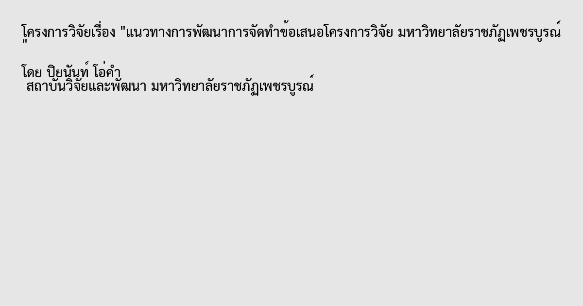 การวิจัยครั้งนี้มีวัตถุประสงค์เพื่อศึกษาสภาพปัจจุบันและความต้องการเกี่ยวกับการพัฒนาระบบกลไกการบริหารจัดการงานวิจัย และนำข้อมูลที่ได้จากการศึกษาไปกำหนดแนวทางการพัฒนาระบบกลไกการบริหารจัดการงานวิจัย มหาวิทยาลัยราชภัฏเพชรบูรณ์ กลุ่มตัวอย่างในการศึกษาครั้งนี้ได้แก่คณาจารย์ที่ได้รับทุนอุดหนุนการวิจัยจากมหาวิทยาลัยราชภัฏเพชรบูรณ์ ประจำปีงบประมาณ พ.ศ. 2561 จำนวน 89 คน โดยใช้วิธีการสุ่มแบบบังเอิญ (Accidental sampling) จากนั้นวิเคราะห์ข้อมูลแสดงผลในสถิติพรรณนา (Descriptive statistics) ได้แก่ ความถี่ ร้อยละ และค่าเฉลี่ย