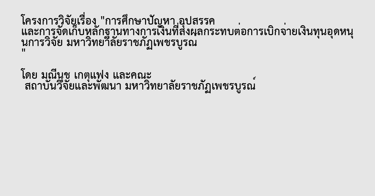 การศึกษาปัญหา อุปสรรค และการจัดเก็บหลักฐานทางการเงินที่ส่งผลกระทบต่อการเบิกจ่ายเงินทุนอุดหนุนการวิจัย มหาวิทยาลัยราชภัฏเพชรบูรณ์