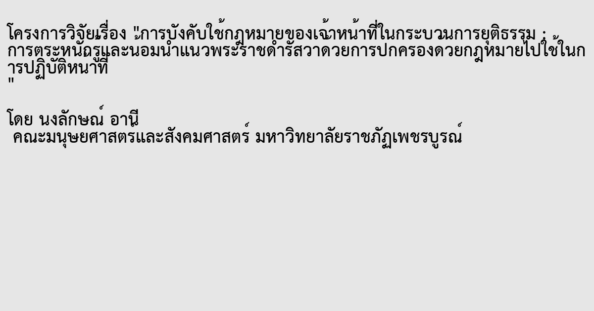 การบังคับใช้กฎหมายของเจ้าหน้าที่ในกระบวนการยุติธรรม : การตระหนักรู้และน้อมนำแนวพระราชดำรัสว่าด้วยการปกครองด้วยกฎหมายไปใช้ในการปฏิบัติหน้าที่