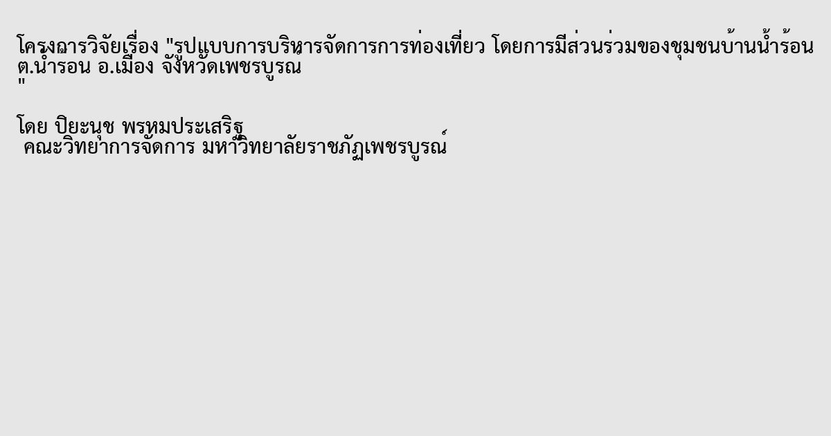 รูปแบบการบริหารจัดการการท่องเที่ยว โดยการมีส่วนร่วมของชุมชนบ้านน้ำร้อน ต.น้ำร้อน อ.เมือง จังหวัดเพชรบูรณ์