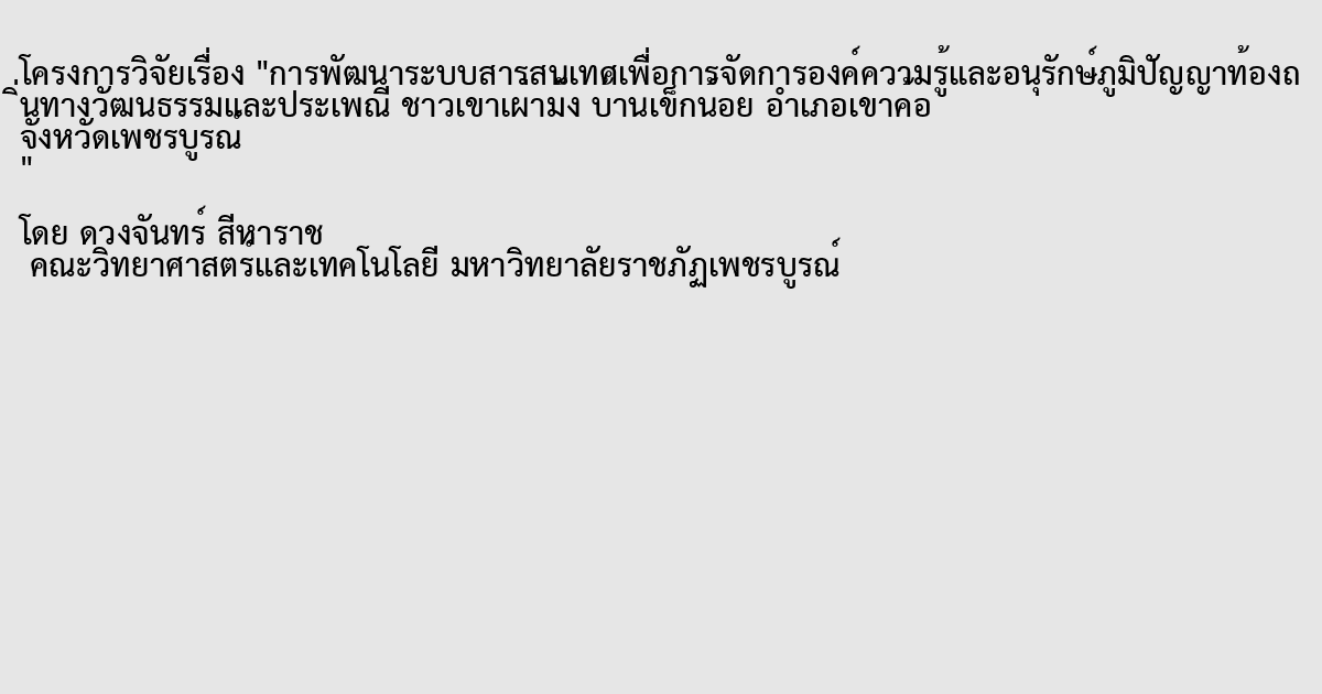 การวิจัยครั้งนี้มีจุดมุ่งหมาย 1) เพื่อศึกษาและรวบรวมข้อมูลภูมิปัญญาท้องถิ่นทางวัฒนธรรมและประเพณี ชาวเขาเผ่าม้ง บ้านเข็กน้อย อำเภอเขาค้อ จังหวัดเพชรบูรณ์ 2) เพื่อพัฒนาระบบสารสนเทศเพื่อจัดการองค์ความรู้และอนุรักษ์ภูมิปัญญาท้องถิ่นทางวัฒนธรรมและประเพณี ชาวเขาเผ่าม้ง บ้านเข็กน้อย อำเภอเขาค้อ จังหวัดเพชรบูรณ์ และ 3) เพื่อประเมินประสิทธิภาพการทำงานและความพึงพอใจผู้ใช้ต่อระบบสารสนเทศเพื่อจัดการองค์ความรู้และอนุรักษ์ภูมิปัญญาท้องถิ่นทางวัฒนธรรมและประเพณี ชาวเขาเผ่าม้ง บ้านเข็กน้อย อำเภอเขาค้อ จังหวัดเพชรบูรณ์ กลุ่มตัวอย่างที่ใช้เก็บรวบรวมข้อมูล คือ กลุ่มผู้ใช้งานทั่วไป และกลุ่มผู้ดูแลระบบ จำนวน 8 คน ซึ่งเป็นนักวิชาการด้านภูมิปัญญาท้องถิ่นทางวัฒนธรรมและประเพณีชาวเขาเผ่าม้ง นักวิชาการคอมพิวเตอร์ นักวิชาการด้านสารสนเทศขององค์การบริหารส่วนตำบลเข็กน้อย และปราชญ์ชาวบ้าน โดยการคัดเลือกแบบเจาะจง เครื่องมือที่ใช้ในการรวบรวมข้อมูล คือ แบบประเมินประสิทธิภาพและความพึงพอใจแบบตรวจสอบรายการและมาตราประมาณค่า 5 ระดับ ผลการวิจัย พบว่า ประสิทธิภาพของระบบสารสนเทศเพื่อการจัดการองค์ความรู้และอนุรักษ์ภูมิปัญญาท้องถิ่นทางวัฒนธรรมและประเพณี ชาวเขาเผ่าม้ง บ้านเข็กน้อย กลุ่มผู้ใช้งานทั่วไป ในภาพรวมอยู่ในระดับดีมาก ( x̄ = 4.59) เมื่อพิจารณาเป็นรายด้าน พบว่า ด้านที่มีค่าเฉลี่ยสูงสุด คือ ด้านรูปแบบการนำเสนอ ( x̄ = 4.72) รองลงมา คือ ด้านความสามารถของระบบ ( x̄ = 4.16) และประสิทธิภาพของระบบสารสนเทศเพื่อการจัดการองค์ความรู้และอนุรักษ์ภูมิปัญญาท้องถิ่นทางวัฒนธรรมและประเพณี ชาวเขาเผ่าม้ง บ้านเข็กน้อย กลุ่มผู้ดูแลระบบ ในภาพรวมอยู่ในระดับดีมาก ( x̄ = 4.64) เมื่อพิจารณาเป็นรายด้าน พบว่า ด้านที่มีค่าเฉลี่ยสูงสุด คือ ด้านรูปแบบการนำเสนอ ( x̄ = 4.67) รองลงมา คือ ด้านความสามารถของระบบ ( x̄ = 4.64)