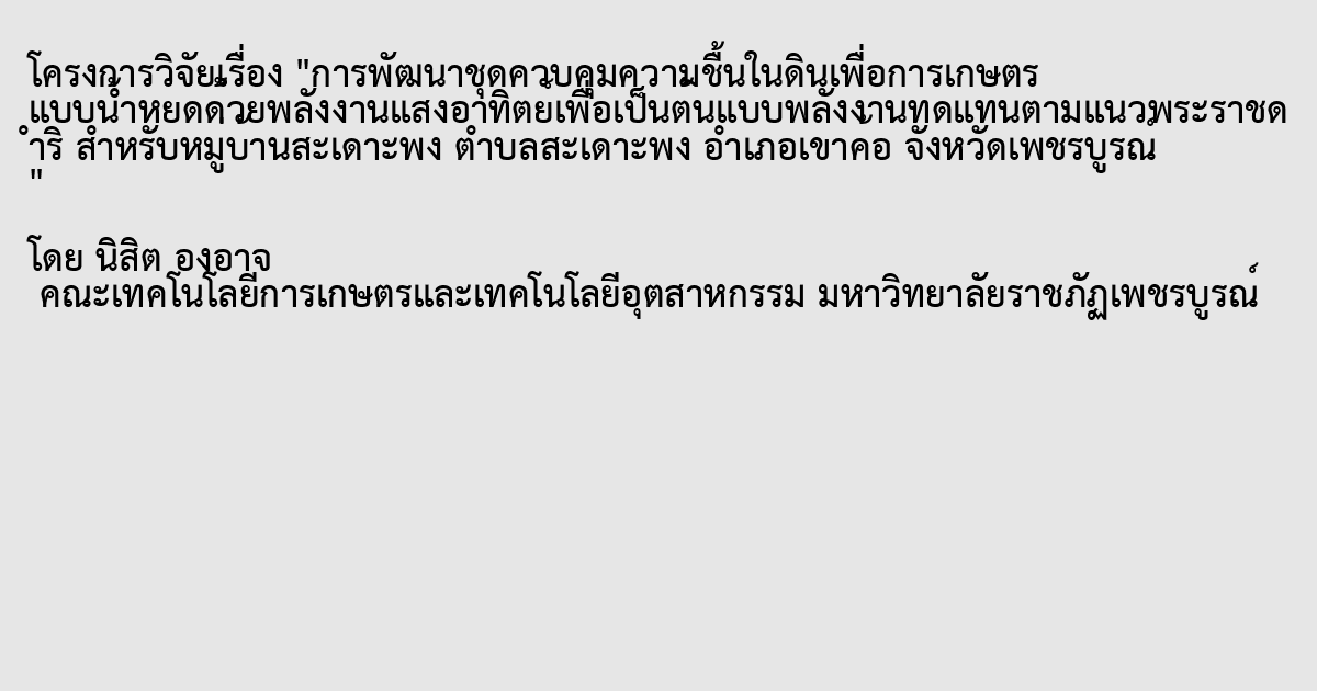 การพัฒนาชุดควบคุมความชื้นในดินเพื่อการเกษตร แบบน้ำหยดด้วยพลังงานแสงอาทิตย์เพื่อเป็นต้นแบบพลังงานทดแทนตามแนวพระราชดำริ สำหรับหมู่บ้านสะเดาะพง ตำบลสะเดาะพง อำเภอเขาค้อ จังหวัดเพชรบูรณ์