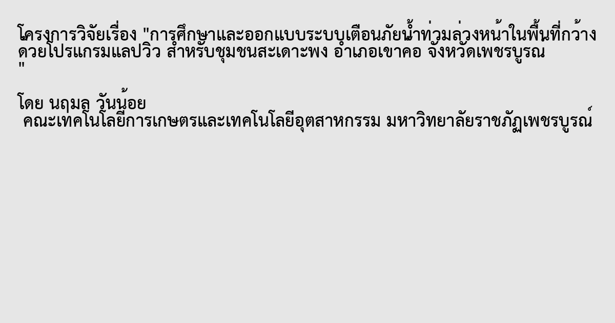 การศึกษาและออกแบบระบบเตือนภัยน้ำท่วมล่วงหน้าในพื้นที่กว้าง ด้วยโปรแกรมแลปวิว สำหรับชุมชนสะเดาะพง อำเภอเขาค้อ จังหวัดเพชรบูรณ์