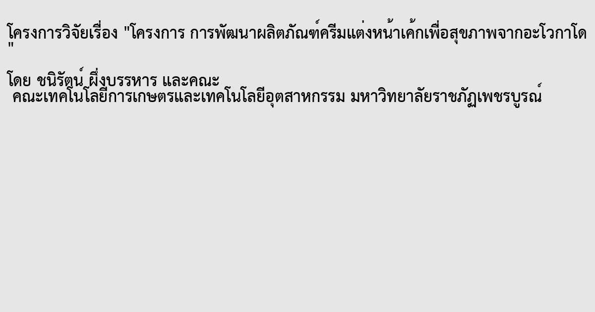 งานวิจัยนี้มีวัตถุประสงค์ เพื่อศึกษาสูตรที่เหมาะสมของครีมแต่งหน้าเค้กเพื่อสุขภาพจาก อะโวกาโดที่ผู้บริโภคยอมรับ นำไปศึกษาสารให้ความคงตัวที่ส่งผลต่อคุณภาพของครีมแต่งหน้าเค้กเพื่อสุขภาพจากอะโวกาโด และเปรียบเทียบคุณค่าทางโภชนาการ จากการศึกษาสูตรที่เหมาะสมของครีมแต่งหน้าเค้กเพื่อสุขภาพจากอะโวกาโดที่ผู้บริโภคยอมรับ พบว่า สูตรที่ 1 (Junjira’s Sweet 1) ได้รับการยอมรับมากที่สุด ซึ่งยอมรับได้ในทุกๆคุณลักษณะ มีค่าคะแนนเฉลี่ยสูงกว่าสูตรที่2 และ3 มีความแตกต่างอย่างมีนัยสำคัญทางสถิติ (p≤0.05) ด้านสี รสชาติ และเนื้อสัมผัส โดยสูตรที่ 1 นี้มีส่วนผสมของ อะโวกาโด เนยสดรสเค็ม นมข้นจืด น้ำตาลไอซิ่ง และวนิลา คิดเป็นร้อยละ 26.74 26.74 16.04 29.41 และ 1.07 ตามลำดับ ศึกษาการเสริมสารเพิ่มความคงตัว พบว่า ผู้ทดสอบ 45 คน ให้การยอมรับครีมแต่งหน้าเค้กเพื่อสุขภาพจากอะโวกาโดใส่สารเพิ่มความคงตัว (กัมอราบิก) สูตรที่ 3 มากที่สุด โดยมีความแตกต่างอย่างมีนัยสำคัญทางสถิติ (p≤0.05) ค่าการยอมรับในด้านเนื้อสัมผัส (ความคงตัว) อยู่ที่ระดับความชอบปานกลาง สูตรที่3 (กัมอราบิก) นี้มีส่วนผสมของอะโวกาโด เนยสดรสเค็ม นมข้นจืด น้ำตาลไอซิ่ง วนิลา และ กัมอราบิก คิดเป็นร้อยละ 26.21 26.21 28.84 15.76 1.05 และ 1.96 ตามลำดับ ผลการบีบครีมแต่งหน้าเค้กเพื่อสุขภาพจากอะโวกา-โดที่ใส่สารให้ความคงตัว จากผู้ชำนาญการแต่งหน้าเค้ก พบว่ามีค่าคะแนนเฉลี่ยของสูตรที่ 3 (กัมอราบิก) คะแนนดีที่สุดในทุกๆลักษณะปรากฏ ด้านสี ความคงตัว ความคมชัดของลายบีบ และความชอบโดยรวม มีค่าความชอบที่ระดับความชอบปานกลาง สูตรครีมแต่งหน้าเค้กเพื่อสุขภาพจากอะโวกาโด มีพลังงานน้อยกว่าสูตรครีมแต่งหน้าเค้กที่มีเนยขาว 1,925.62 กิโลแคลอรี่ มีไขมันน้อยกว่า 226.63 กรัม มีแคลเซียมมากกว่า 40 กรัม มีเบต้าแคโรทีนมาก กว่า 325 ไมโครกรัม และมีไขมันอิ่มตัวน้อยกว่า 133.91 กรัม