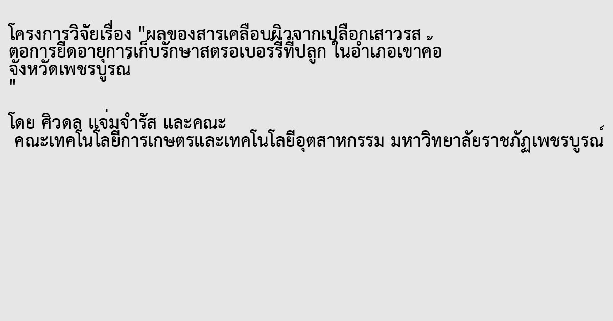 การวิจัยนี้มีวัตถุประสงค์เพื่อศึกษาการยืดอายุการเก็บรักษาสตรอเบอร์รี่ที่ปลูกในอำเภอเขาค้อ จังหวัดเพชรบูรณ์ โดยใช้สารเคลือบผิวที่สารมารถบริโภคได้ซึ่งสกัดได้จากเปลือกเสาวรส