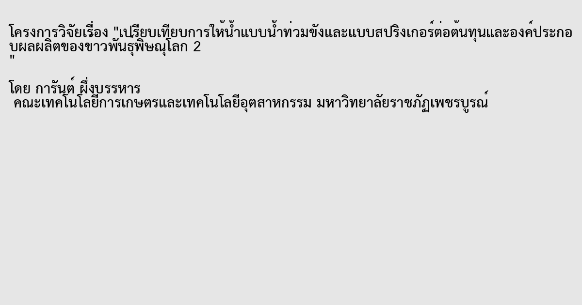 อิทธิพลของระบบการให้น้ำต่อองค์ประกอบผลผลิตของข้าวไม่ไวแสง 3 พันธุ์ ทำการวางแผนการทดลองแบบ 3 x 2 factorial in Randomized complete block design (RBD) ระหว่างเดือนเมษายนถึงเดือนสิงหาคม 2561 ณ แปลงนาสาธิตทางการเกษตรคณะเทคโนโลยีการเกษตรและเทคโนโลยีอุตสาหกรรม มหาวิทยาลัยราชภัฏเพชรบูรณ์ ต่อการเจริญเติบโตของข้าวไม่ไวแสง 3 พันธุ์ ได้แก่ข้าวพันธุ์ กข29 พิษณุโลก2 และปทุมธานี1 ภายใต้การให้น้ำที่แตกต่างกัน 2 วิธี คือ การให้น้ำท่วมขังหลังข้าวงอก 7 วัน โดยให้น้ำท่วมขังที่ระดับ 5 - 10 เซนติเมตร ตลอดฤดูกาล และการให้น้ำสปริงเกลอร์ วันละ 1 - 2 ชั่วโมง พบว่า พันธุ์ข้าวส่งผลต่อความสูงและจำนวนต้นต่อกอมีความแตกต่างกันอย่างมีนัยสำคัญทางสถิติ แต่จำนวนรวงต่อกอไม่มีความแตกต่างกันอย่างมีนัยสำคัญทางสถิติ ส่วนวิธีการให้น้ำด้านความสูงมีความแตกต่างกันอย่างมีนัยสำคัญทางสถิติแต่จำนวนต้นต่อกอและจำนวนรวงต่อกอไม่มีความแตกต่างกันอย่างมีนัยสำคัญทางสถิติ สำหรับองค์ประกอบผลผลิตของข้าวไม่ไวแสงทั้ง 3 พันธุ์ ภายใต้การให้น้ำที่แตกต่างกัน พบว่า พันธุ์ข้าวมีความแตกต่างกันอย่างมีนัยสำคัญทางสถิติ ต่อจำนวนเมล็ดต่อรวง เปอร์เซ็นต์เมล็ดดี เปอร์เซ็นต์เมล็ดเสีย น้ำหนัก 1,000 เมล็ด และผลผลิตต่อไร่ สำหรับวิธีการให้น้ำ พบว่า จำนวนเมล็ดต่อรวงและผลผลิตต่อไร่มีความแตกต่างกันอย่างมีนัยสำคัญทางสถิติ แต่เปอร์เซ็นต์เมล็ดดี เปอร์เซ็นต์เมล็ดเสีย น้ำหนัก 1,000 เมล็ด ไม่มีความแตกต่างกันอย่างมีนัยสำคัญทางสถิติ