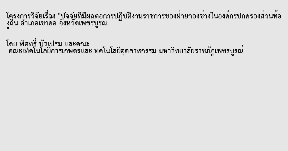 งานวิจัยนี้ปัจจัยที่มีผลต่อการปฏิบัติงานราชการของฝ่ายกองช่างในองค์กรปกครองส่วนท้องถิ่นอำเภอเขาค้อ จังหวัดเพชรบูรณ์ โดยมีวัตถุประสงค์ ศึกษาปัจจัยที่มีผลต่อการปฏิบัติงานราชการของฝ่ายกองช่างในองค์กรปกครองส่วนท้องถิ่นอำเภอเขาค้อ จังหวัดเพชรบูรณ์