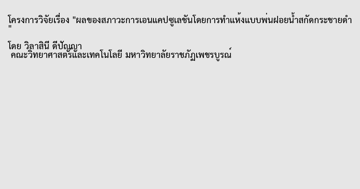 งานวิจัยนี้มีวัตถุประสงค์เพื่อศึกษาผลสภาวะที่เหมาะสมของการเอนแคปซูเลชันน้ำสกัดกระชายดำโดยใช้มอลโตเด็กซ์ทริน และกัมอะราบิก เป็นสารเอนแคปซูเลติ้งที่ความเข้มข้นร้อยละ 10 w/v ปัจจัยที่ศึกษา ได้แก่ อุณหภูมิขาเข้า 3 ระดับ คือ 140 150 และ 160 องศาเซลเซียส ผลการศึกษาพบว่า ปริมาณแอนโทไซยานิน และปริมาณฟีนอลิคทั้งหมดลดลงอย่างมีนัยสำคัญ เมื่ออุณหภูมิขาเข้าเพิ่มขึ้น สภาวะที่เหมาะสมของการเอนแคปซูเลชันโดยการทำแห้งแบบพ่นฝอยของน้ำกระชายดำ คือ ที่สภาวะอุณหภูมิขาเข้า 140 องศาเซลเซียส ศึกษาความคงตัวของผงกระชายดำที่ผ่านการเอนแคปซูเลชันในระหว่างการเก็บรักษาที่อุณหภูมิ 4 30 และ 45 องศาเซลเซียสเป็นเวลา 21 วัน พบว่าเมื่ออุณหภูมิในการเก็บรักษาสูงขึ้นและระยะเวลาในการเก็บรักษาเพิ่มขึ้น มีผลทำให้ปริมาณแอนโทไซยานิน และปริมาณฟีนอลิคทั้งหมดอัตราลดลงที่อุณหภูมิเก็บรักษาที่ 4 องศาเซลเซียส มีค่าคงที่ของอัตราการเกิดปฏิกิริยาต่ำที่สุด 0.007 และ 0.012 day-1ตามลำดับ และค่าครึ่งชีวิต(t1/2) สูงที่สุดถึง 99 และ 301 วัน ตามลำดับ จากผลการศึกษานี้แสดงว่าผงกระชายดำที่ผ่านการเอนแคปซูเลชันมีความคงตัวสูง และมีอายุการเก็บรักษานานเมื่อเก็บรักษาภายใต้สภาวะอุณหภูมิ 4 องศาเซลเซียส