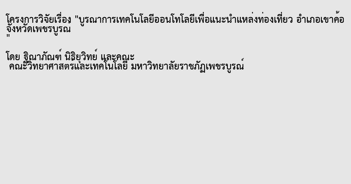 การวิจัยครั้งนี้มีวัตถุประสงค์เพื่อ 1) ศึกษาและรวบรวมแหล่งท่องเที่ยวทางธรรมชาติ ทางการเกษตร และทางวัฒนธรรมและประเพณี ในเขตอำเภอเขาค้อ จังหวัดเพชรบูรณ์ 2) เพื่อพัฒนาระบบแนะนำแหล่งท่องเที่ยวทางธรรมชาติ ทางการเกษตร และทางวัฒนธรรมและประเพณี ในเขตอำเภอเขาค้อ จังหวัดเพชรบูรณ์ ในรูปแบบออนโทโลยี และ 3) เพื่อประเมินประสิทธิภาพระบบแนะนำแหล่งท่องเที่ยวทางธรรมชาติ ทางการเกษตร และทางวัฒนธรรมและประเพณี ในเขตอำเภอเขาค้อ จังหวัดเพชรบูรณ์ในรูปแบบออนโทโลยี ซึ่งผู้วิจัยได้กำหนดขั้นตอนการดำเนินงานวิจัย 3 ขั้นตอน คือ 1) การเก็บรวบรวมข้อมูลองค์ความรู้การท่องเที่ยวทางธรรมชาติ ทางการเกษตร และทางวัฒนธรรมและประเพณีจากเว็บไซต์ และผู้มีความรู้/ผู้เชี่ยวชาญ 2) การพัฒนาระบบแนะนำ ประกอบด้วย ฐานความรู้ออนโทโลยี ฐานข้อมูลเชิงสัมพันธ์ด้วย โปรแกรม MySQL ภาษา SPARQL command สำหรับประมวลผลออนโทโลยี และภาษา Python และ PHP เพื่อพัฒนาเว็บแอพพลิเคชั่น และ 3) ประเมินประสิทธิภาพระบบแนะนำโดยใช้การหาค่า precision, recall, F-measure และประเมินความพึงพอใจผู้ใช้ต่อระบบ ผลการวิจัยพบว่า ระบบแนะนำแหล่งท่องเที่ยวทางธรรมชาติ ในเขตอำเภอเขาค้อ จังหวัดเพชรบูรณ์ ในรูปแบบออนโทโลยี มีฐานความรู้ออนโทโลยี 3 ระดับชั้น จำนวน 18 โหนดความรู้ และมี 6 กฎในการแนะนำ การประเมินประสิทธิภาพระบบได้ค่า F-measure เท่ากับ 89.7% และผู้ใช้มีความพึงพอใจต่อระบบในภาพรวมอยู่ในระดับมาก (4.48 ± 0.53) ระบบแนะนำแหล่งท่องเที่ยวทางการเกษตร ในเขตอำเภอเขาค้อ จังหวัดเพชรบูรณ์ ในรูปแบบออนโทโลยี มีฐานความรู้ออนโทโลยี 3 ระดับชั้น จำนวน 27 โหนดความรู้ และมี 5 กฎในการแนะนำ การประเมินประสิทธิภาพระบบได้ค่า F-measure เท่ากับ 88.5% และผู้ใช้มีความพึงพอใจต่อระบบในภาพรวมอยู่ในระดับมาก (4.61 ± 0.65) และระบบแนะนำแหล่งท่องเที่ยวทางวัฒนธรรมและประเพณี ในเขตอำเภอเขาค้อ จังหวัดเพชรบูรณ์ ในรูปแบบออนโทโลยี มีฐานความรู้ออนโทโลยี 3 ระดับชั้น จำนวน 25 โหนดความรู้ และมี 5 กฎในการแนะนำ การประเมินประสิทธิภาพของระบบได้ค่า F-measure เท่ากับ 88.9% และผู้ใช้มีความพึงพอใจต่อระบบในภาพรวมอยู่ในระดับมาก (4.59 ± 0.57)