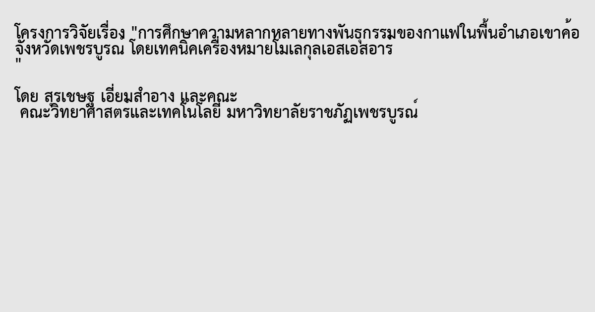 กาแฟเป็นพืชเศรษฐกิจที่สำคัญของจังหวัดเพชรบูรณ์ มีการส่งเสริมให้ปลูกเพื่อสร้างรายได้ให้กับเกษตรกร และมีการพัฒนาพันธุ์มาอย่างต่อเนื่อง และเนื่องจากกาแฟมีความหลากหลายทางพันธุกรรมสูง การวิจัยครั้งนี้จึงมีวัตถุประสงค์เพื่อศึกษาความสัมพันธ์ของพันธุ์กาแฟโดยใช้เครื่องหมายโมเลกุลเอสเอสอาร์เพื่อจำแนกกาแฟ 10 สายต้น โดยเพิ่มปริมาณชิ้นดีเอ็นเอด้วยปฏิกิริยาลูกโซ่พอลิเมอเรส วิเคราะห์โครงสร้างความสัมพันธ์ทางพันธุกรรมด้วยวิธี unweighted pair-group method with arithmetic averaging (UPGMA) และความใกล้ชิดทางพันธุกรรมด้วยการวิเคราะห์ Hierarchical cluster Analysis โดยโปรแกรม SPSS ผลการวิเคราะห์ดัชนีความใกล้ชิดทางพันธุกรรมของกาแฟมีค่าอยู่ในช่วง 1.00-7.00 ผลเดนโดรแกรมสามารถจัดกลุ่มตามความสัมพันธ์และความใกล้ชิดทางพันธุกรรมเป็น 2 กลุ่ม คือ กลุ่มที่ 1 ได้แก่ (7-4,5) , (7-1,7) , (5-6,63) , (5-3,104) , (5-4,104) , (5-2,74) , (5-2,87) ,(4-1,1) และ (4-1,53) กลุ่มที่ 2 ได้แก่ (4-1,39) จากการศึกษาพบว่า เครื่องหมายโมเลกุลเอสเอสอาร์สามารถจำแนกกาแฟออกเป็นกลุ่มได้แม้กาแฟเป็นชนิดเดียวกันแต่มีการผสมข้ามมาแล้วหลายรุ่นเพื่อเป็นการหาความบริสุทธิ์ของสายพันธุ์และแนวทางในการปรับปรุงพันธุ์กาแฟให้มีคุณภาพที่ดีต่อไป