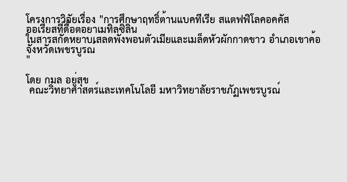 การศึกษาฤทธิ์ต้านแบคทีเรีย สแตฟฟิโลคอคคัส ออเรียสที่ดื้อต่อยาเมทิลซิลิน ในสารสกัดหยาบเสลดพังพอนตัวเมียและเมล็ดหัวผักกาดขาว อำเภอเขาค้อ จังหวัดเพชรบูรณ์