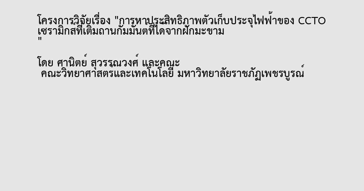 จังหวัดเพชรบูรณ์ มีมะขามหวานเป็นผลไม้ที่เป็นพืชผลทางเศรษฐกิจที่สำคัญ แต่ฝักมะขามเป็นสิ่งเหลือทิ้งจากการรับประทาน ในงานวิจัยนี้ ผู้วิจัยได้สนใจนำฝักมะขามมาสังเคราะห์เป็นถ่านกัมมันต์ ภายใต้ความดันบรรยากาศ แล้วทำการกระตุ้นด้วย KOH จากนั้นล้างด้วยกรด HCl จะได้ถ่านกัมมันต์จากฝักมะขาม ซึ่งมีรูพรุนของคาร์บอนสูงมาก วิเคราะห์โดยเทคนิค XRD และภาพถ่าย SEM จากนั้นทำการสังเคราะห์สาร CaCu3Ti4O12 (CCTO) ซึ่งมีค่าไดอิเล็กทริกสูง ด้วยวิธีผสมสารอย่างง่าย และเติมถ่านกัมมันต์ลงในสาร CCTO ตามสัดส่วน 10, 15, 25 และ 50 mol% ตามลำดับ และทำการวิเคราะห์โครงสร้างเฟสด้วย XRD แล้วตรวจสอบลักษณะอนุภาคและรูพรุนด้วยเทคนิค SEM พบว่า ที่ 50 mol% มีเฟสของคาร์บอนที่สูงขึ้น และมีรูพรุนเป็นปริมาณมาก