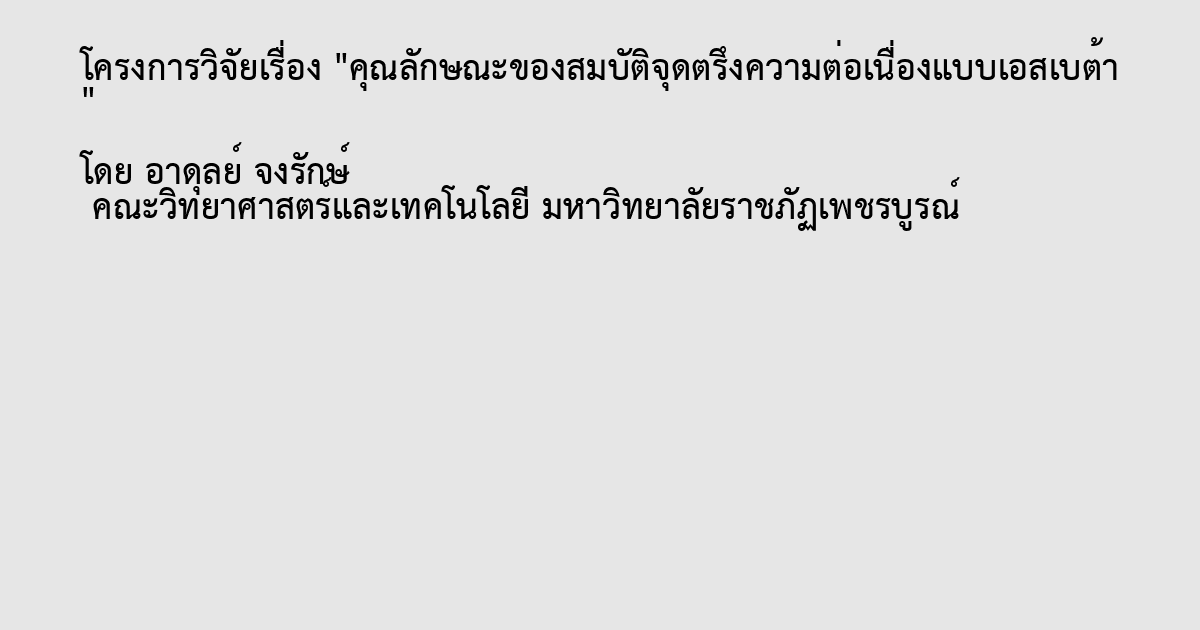 ในงานวิจัยนี้เราได้นำความต่อเนื่องแบบเอสเบต้านิยาม สมบัติจุดตรึงความต่อเนื่องแบบเอสเบต้าและศึกษาบางคุณลักษณะของ สมบัติความต่อเนื่องแบบเอสเบต้าดังกล่าวพบว่า สำหรับปริภูมิเชิงทอพอโลยี(X, τ ) ที่เป็นปริภูมิเรกูลาร์และโลคัลลี่อินดีสครีตซึ่งมีสมบัติจุดตรึงความต่อเนื่องแบบ เอสเบต้า ถ้า σ เป็นทอพอโลยีสำหรับ X ที่เข้มกว่า τ และ clG(τ) = clG(σ) สำหรับทุกเซตเปิด G ใน (X, σ) แล้ว (X, σ) มีสมบัติจุดตรึง