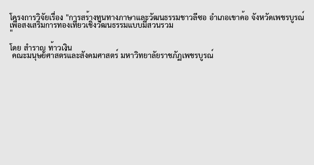 งานวิจัยเรื่องการสร้างทุนทางภาษาและวัฒนธรรมชาวลีซอ อำเภอเขาค้อ จังหวัดเพชรบูรณ์ เพื่อส่งเสริมการท่องเที่ยวเชิงวัฒนธรรมแบบมีส่วนร่วม มีวัตถุประสงค์ 1) เพื่อการฟื้นฟูและอนุรักษ์ภาษาและวัฒนธรรมประเพณีการละเล่นของชาวลีซอผ่านกระบวนการมีส่วนร่วมของชุมชน 2) เพื่อการสร้างทุนทางภาษาและวัฒนธรรมของชาวลีซอ จังหวัดเพชรบูรณ์ เพื่อส่งเสริมการท่องเที่ยวเชิงวัฒนธรรม ประชากรที่ใช้ในการศึกษา ได้แก่ ชาวเขาเผ่าลีซอ บ้านเพชรดำ อำเภอเขาค้อ จังหวัดเพชรบูรณ์ โดยการเลือกแบบเจาะจง เครื่องมือที่ใช้ในการวิจัยได้แก่ แบบสัมภาษณ์ในการสนทนากลุ่ม การสร้างรูปแบบกิจกรรมตามข้อตกลง การวิเคราะห์ข้อมูลโดยการสรุป พรรณนา และสร้างรูปแบบกิจกรรมที่ต้องการ