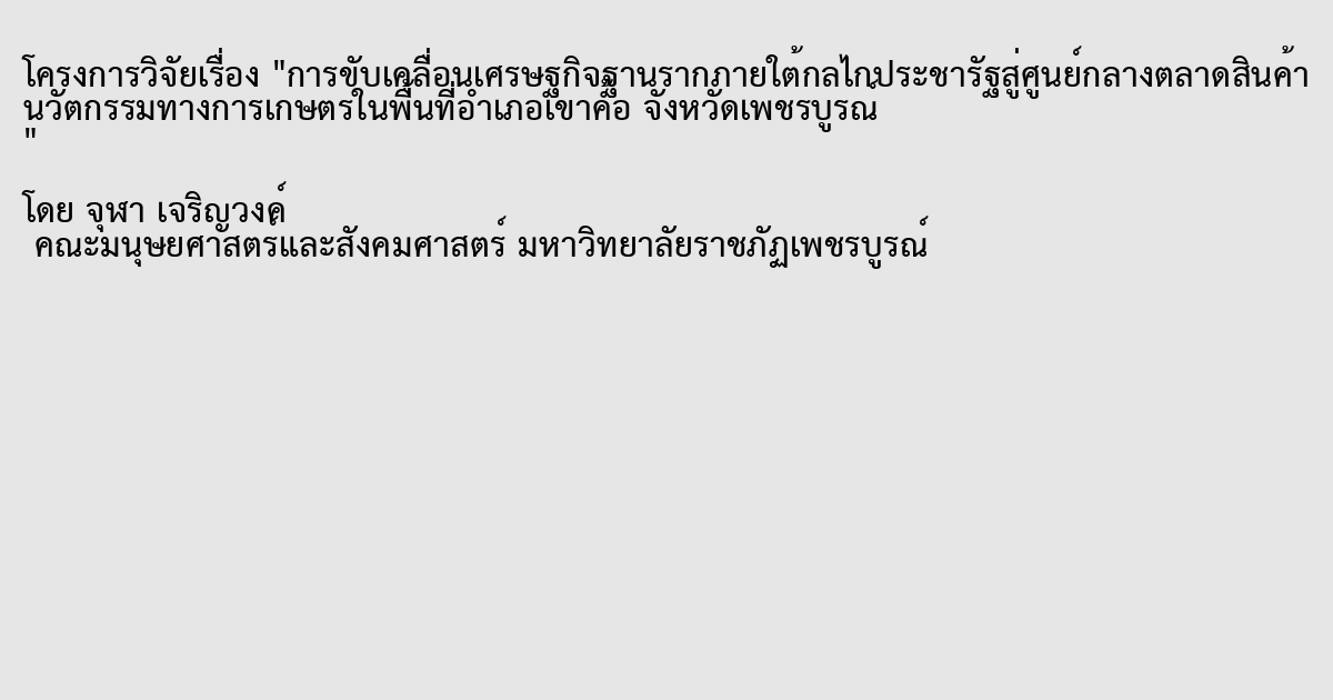 การวิจัยครั้งนี้ มีวัตถุประสงค์เพื่อ 1) สำรวจและวิเคราะห์ศักยภาพเศรษฐกิจฐานรากแต่ละประเภทที่มีอยู่ในพื้นที่อำเภอเขาค้อ จังหวัดเพชรบูรณ์ 2) ศึกษากระบวนการและแนวทางการขับเคลื่อนเศรษฐกิจฐานรากที่ผ่านการสำรวจวิเคราะห์ภายใต้กลไกประชารัฐในพื้นที่อำเภอเขาค้อ จังหวัดเพชรบูรณ์ 3) ทดลองผลจากการศึกษากระบวนการและแนวทางการขับเคลื่อนเศรษฐกิจฐานรากที่ดำเนินการด้วยกลไกประชารัฐในพื้นที่อำเภอเขาค้อ จังหวัดเพชรบูรณ์ และ 4) ยกร่างแผนพัฒนาเศรษฐกิจฐานรากภายใต้กลไกประชารัฐในพื้นที่รองรับกับการพัฒนาให้เป็นศูนย์กลางนวัตกรรมสินค้าทางการเกษตรของภูมิภาค กลุ่มเป้าหมาย จากภาคประชาชน จำนวน 50 คน ภาคราชการ จำนวน 10 คน ภาคเอกชน จำนวน 10 คน ภาคการศึกษา จำนวน 10 คน และภาคท้องถิ่น จำนวน 10 คน รวมทั้งสิ้น 90 คน คัดเลือกแบบเจาะจง เครื่องมือวิจัย ได้แก่ แบบสัมภาษณ์เชิงลึกโดยใช้วิธีการสัมภาษณ์เชิงลึกและการจัดสัมมนา วิเคราะห์ข้อมูลด้วยวิธีอุปนัยและนำเสนอในเชิงพรรณนา