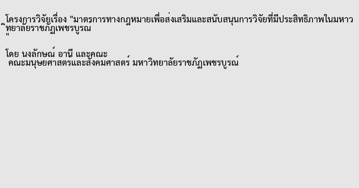 มาตรการทางกฎหมาย,ส่งเสริมและสนับสนุนการวิจัย,การวิจัยที่มีประสิทธิภาพในมหาวิทยาลัยราชภัฏเพชรบูรณ์,legal measures,research promotion and support,effective research in Phetchabun Rajabhat University